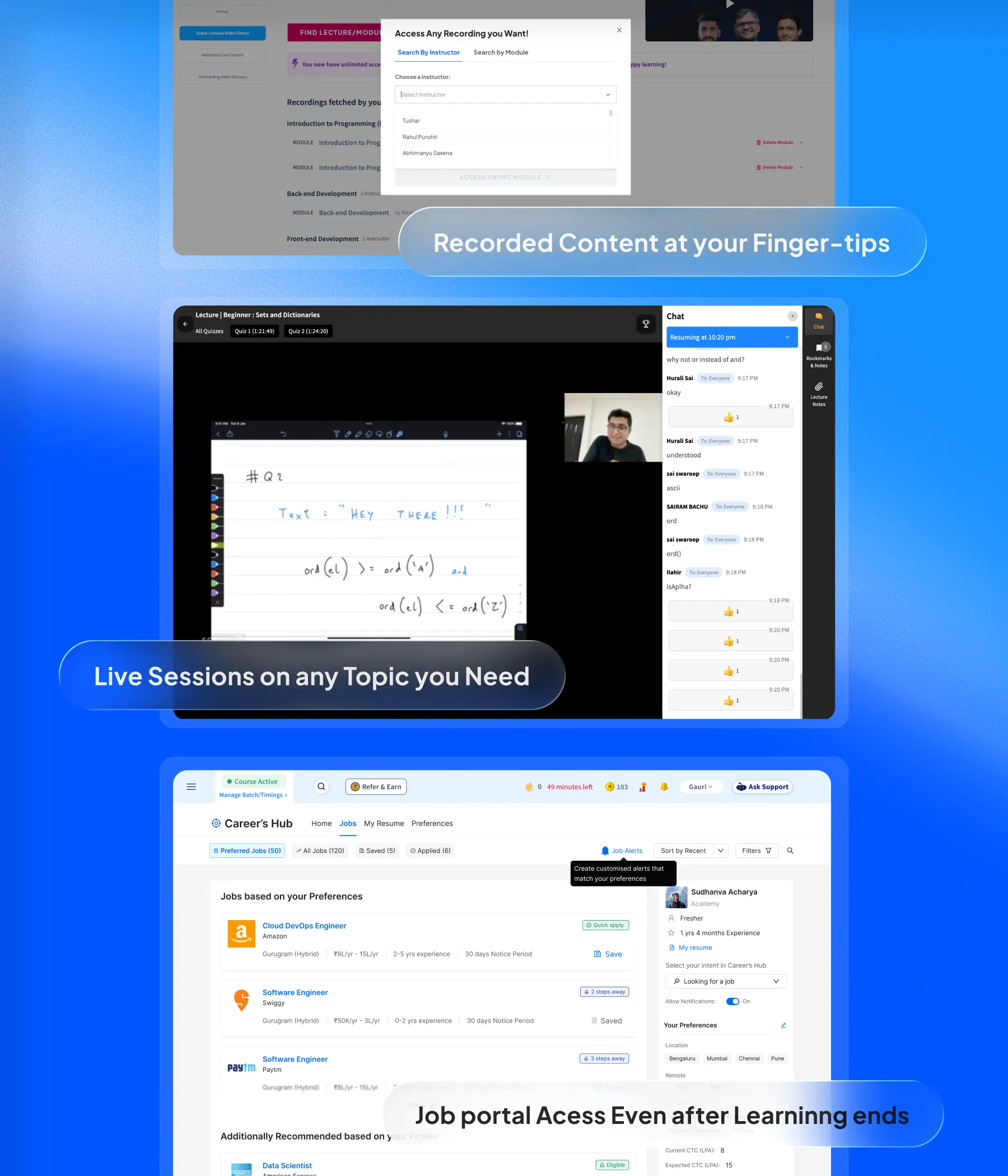 Structured check-ins, career support, and exclusive access to 1,00,000+ Scaler alumni keep you moving long after the program ends. The community outlasts the curriculum.