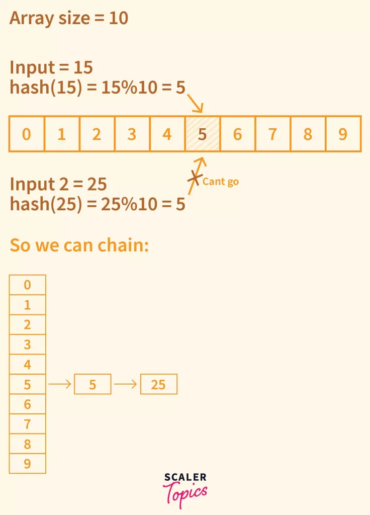 But using the Chaining mechanism, we can place both 15 and 25 at the same 5th Index, by chaining 15 to 25.