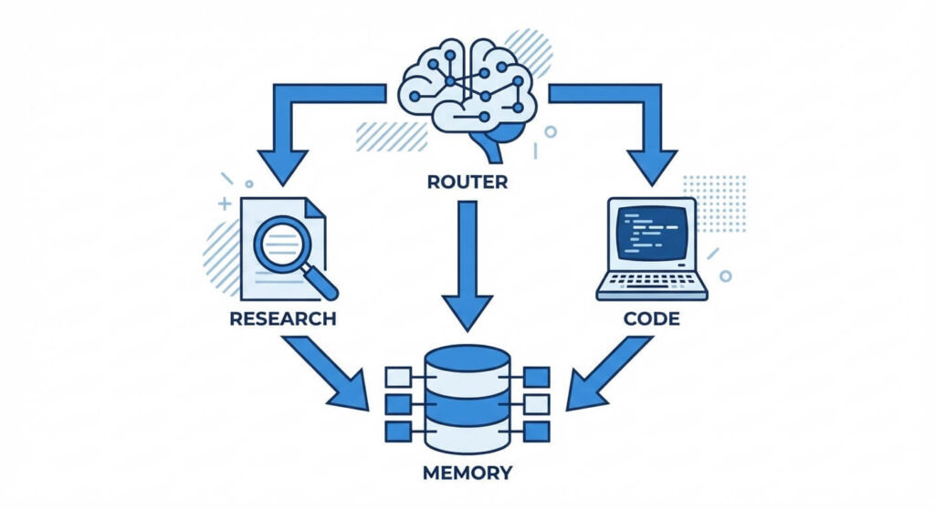 2. Hierarchical Delegation: A “Manager” or “Router” agent receives the user’s prompt, decomposes it into sub-tasks, and delegates those sub-tasks to subordinate “Worker” agents. The Manager aggregates the responses.
