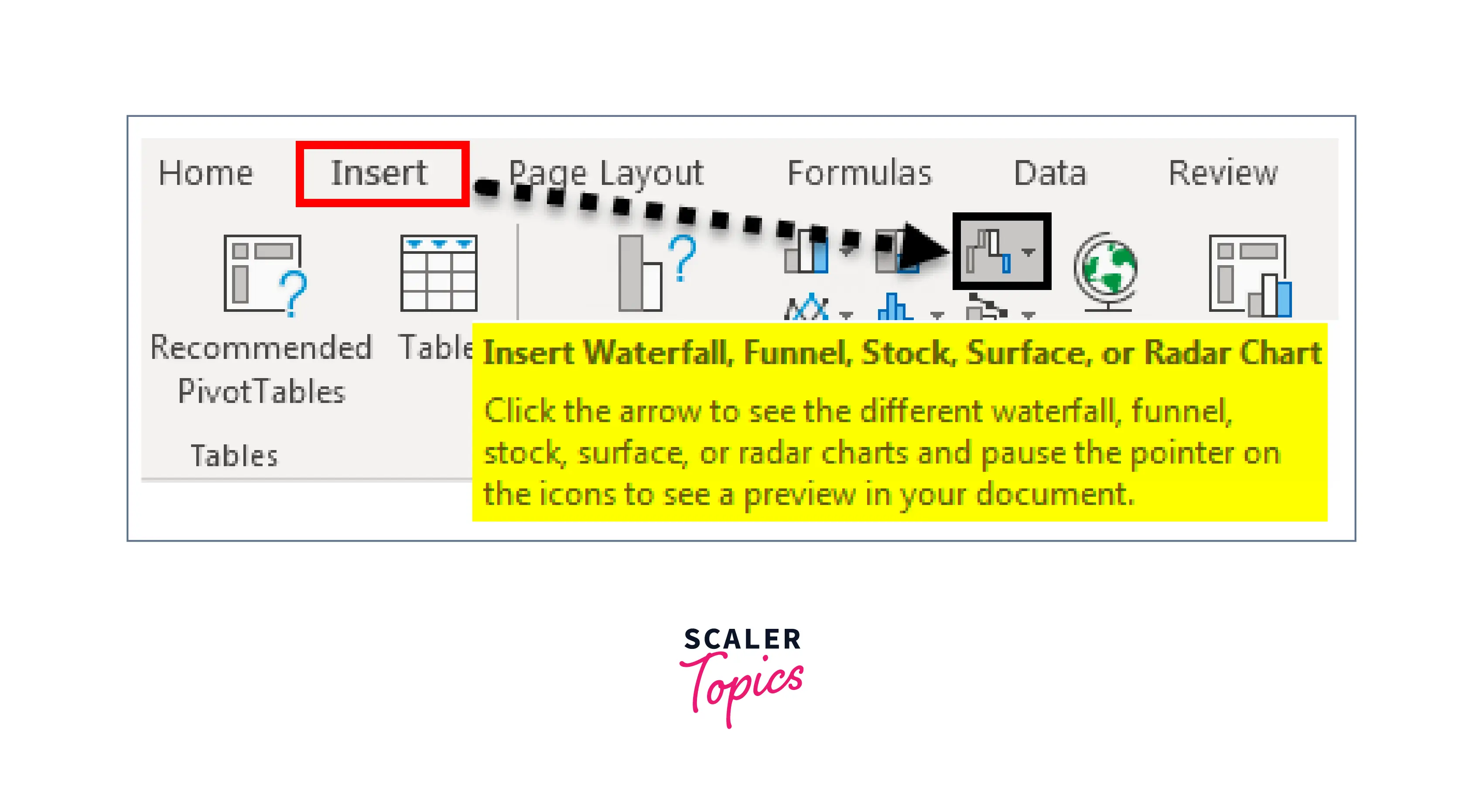 - select the Waterfall, Stock, Surface, or Radar chart option under the Charts section.