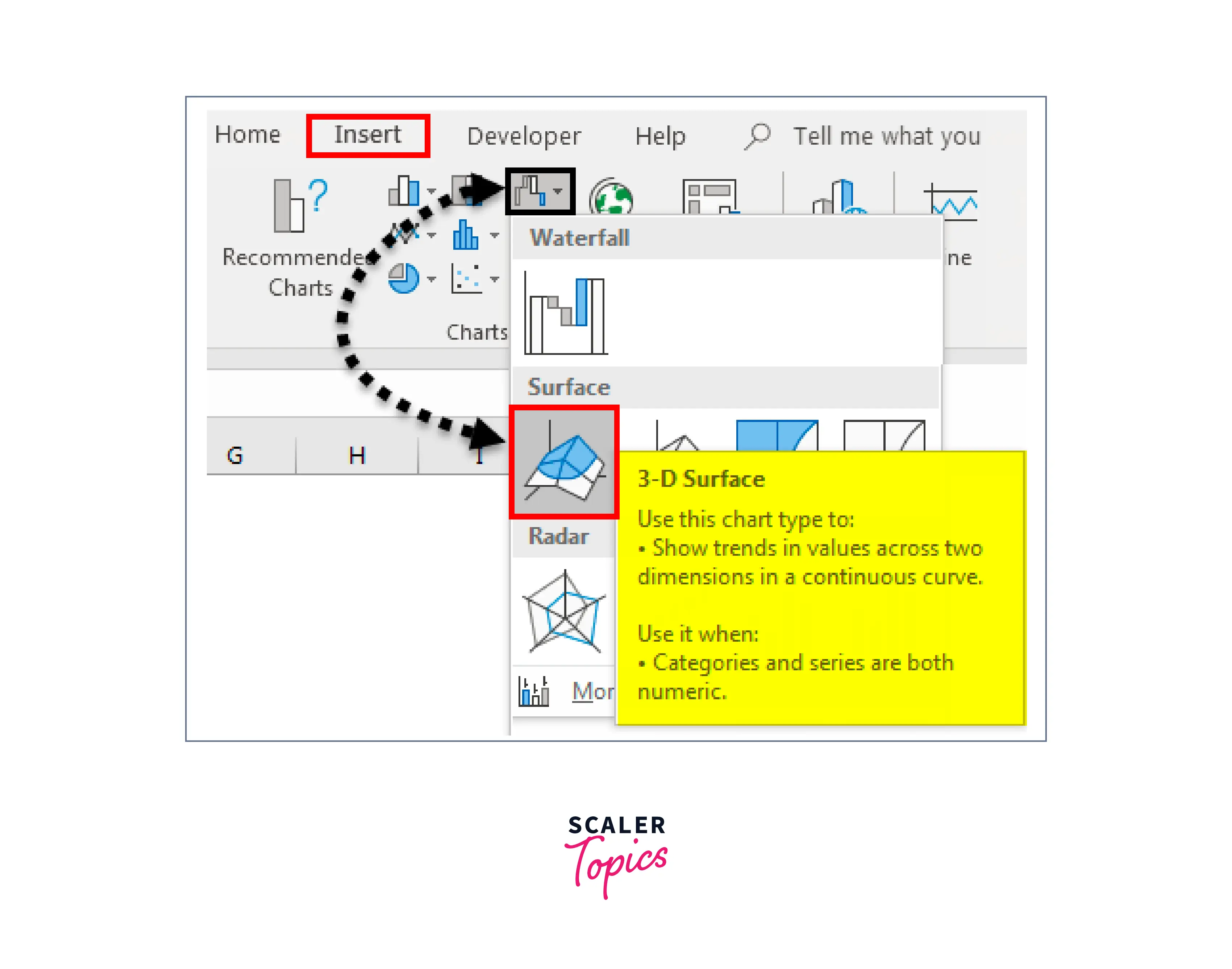 - Excel provides various 3D plot options, including 3D Scatter, Surface, Waterfall, and Radar charts.