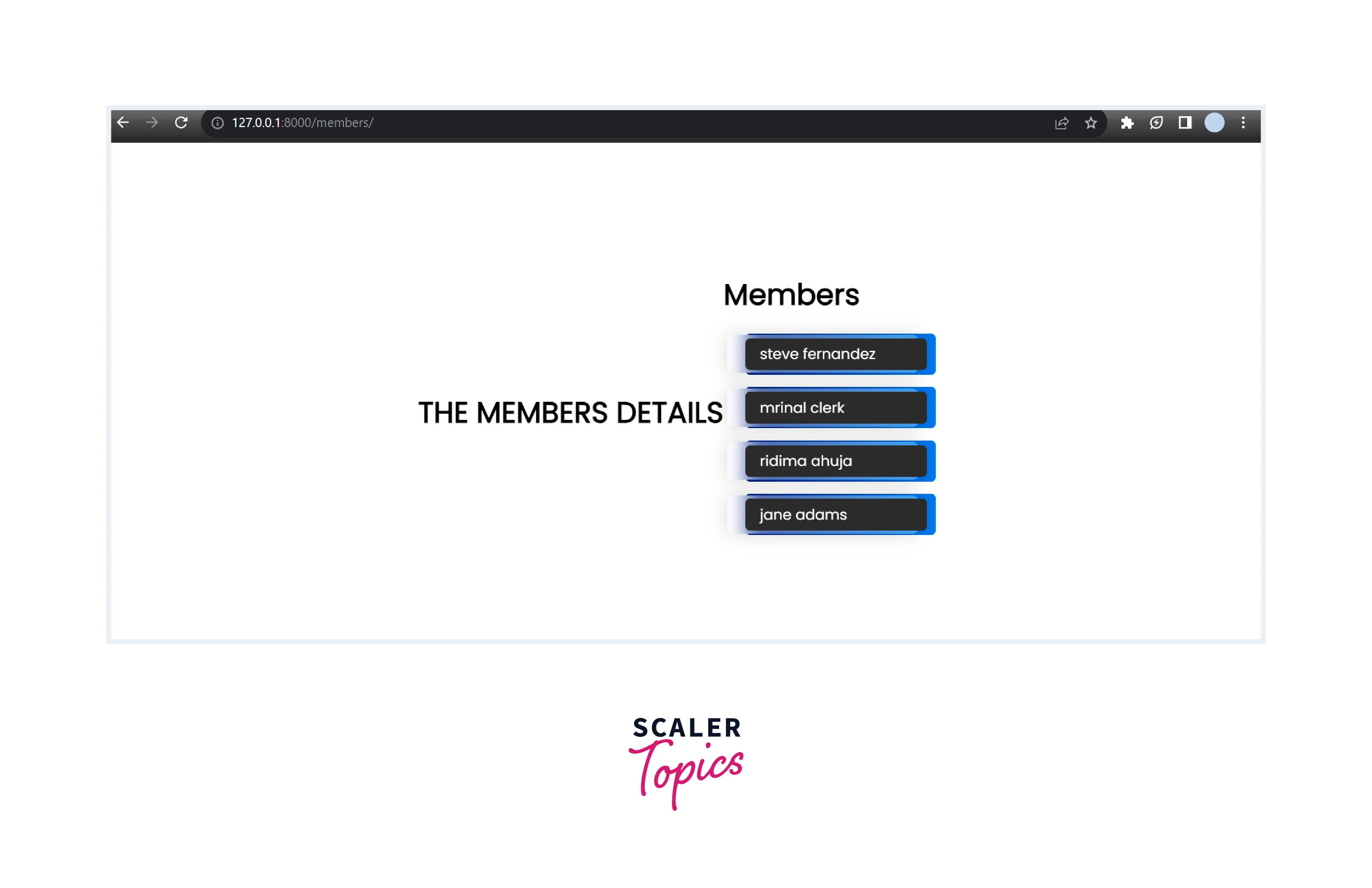 Now run the command py manage.py runserver in the terminal, and after running the project type http://127.0.0.1:8000/members/ in the browser. Then the below page will appear in your browser with the information of the members we have inserted.