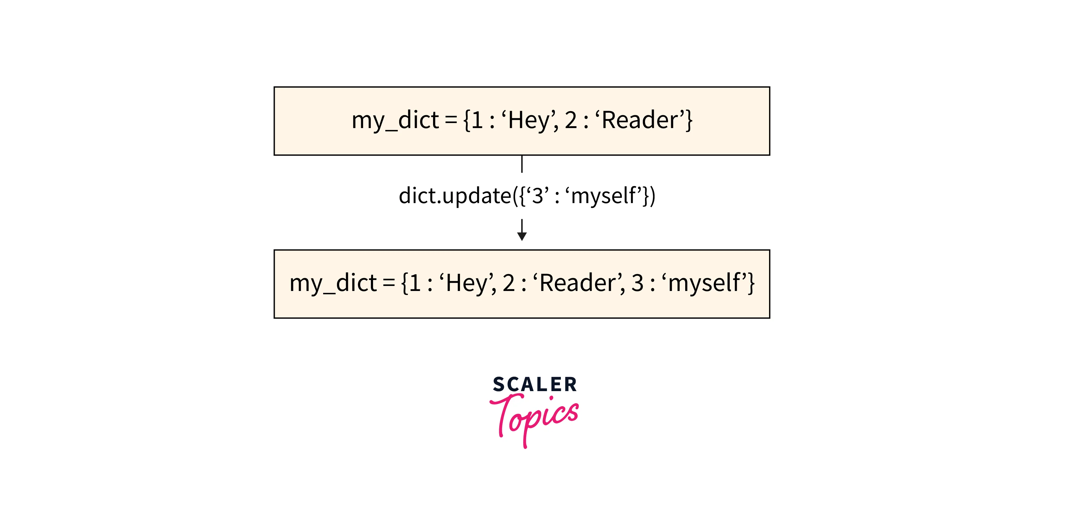 We started with a dict dictionary where we already initiated two pairs of keys and values. Later on line 5, we added a new key-value pair using the update method, which takes the whole object and appends it to the end of the dictionary.