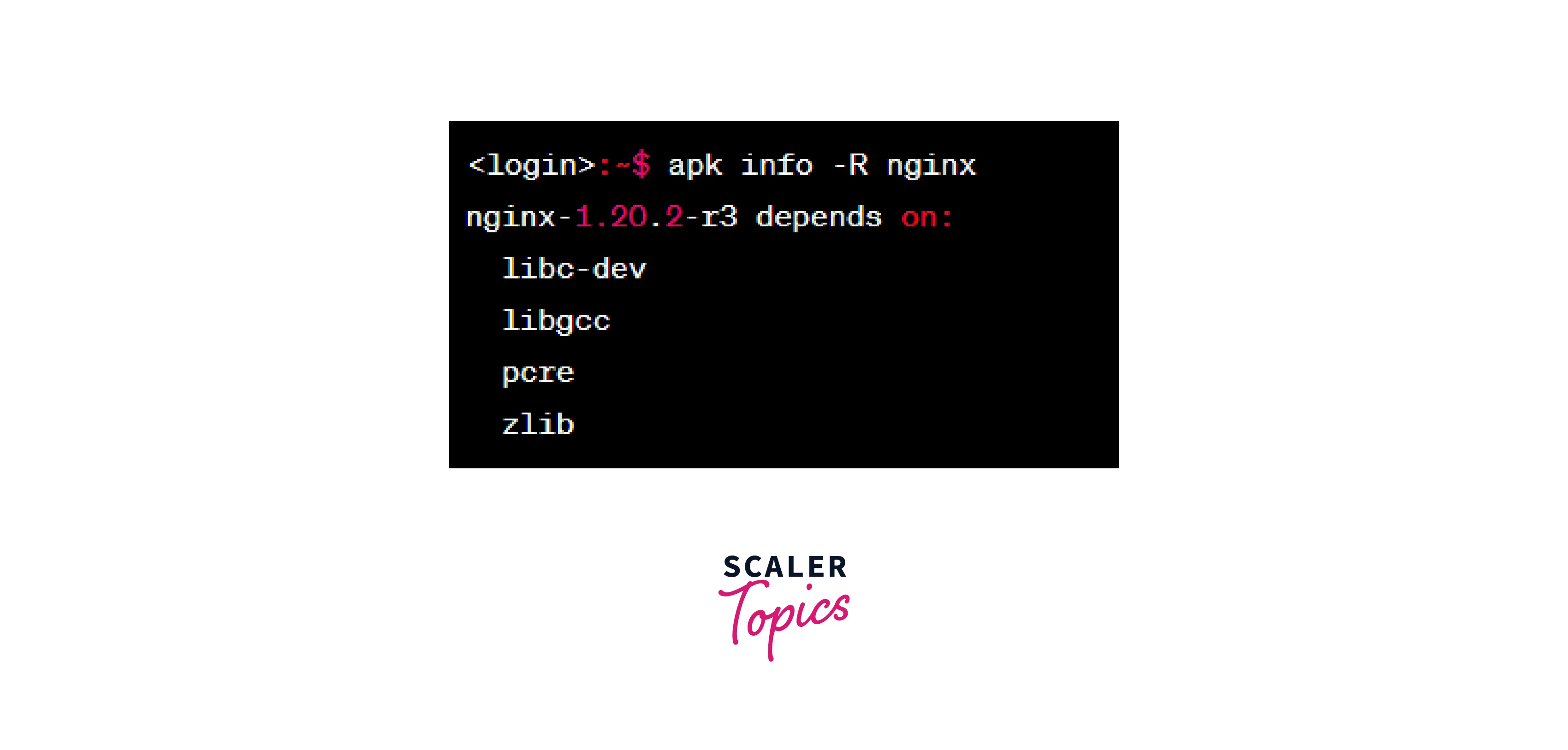 To list the dependencies of a package in Alpine Linux, you can use the apk package manager's info command with the -R option. Here's the command to list the dependencies of a package:
