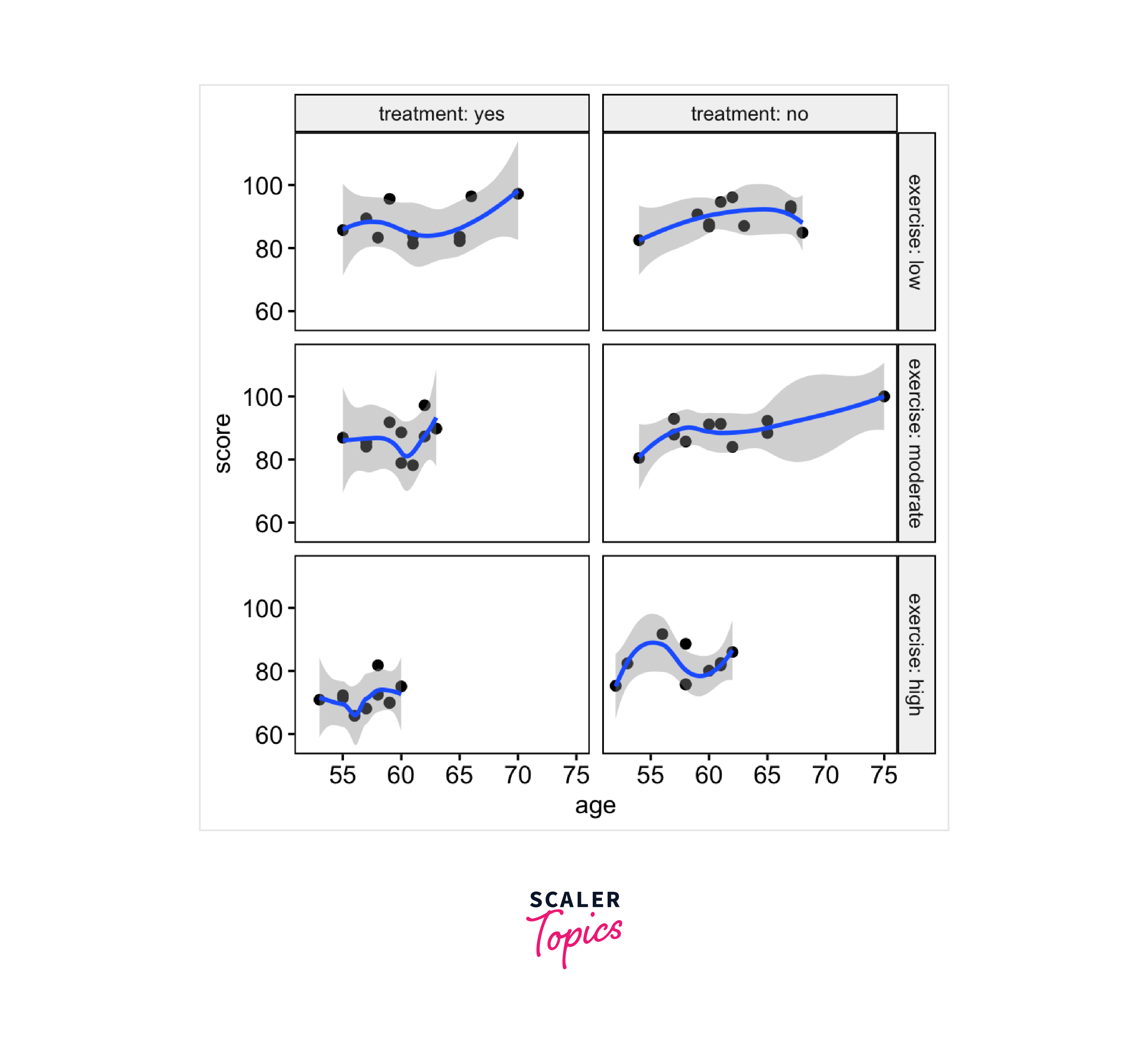 - Linearity Assumption: Check for linearity by creating scatter plots between the covariate (age) and the outcome variable (score) for each combination of the grouping variables (treatment and exercise).