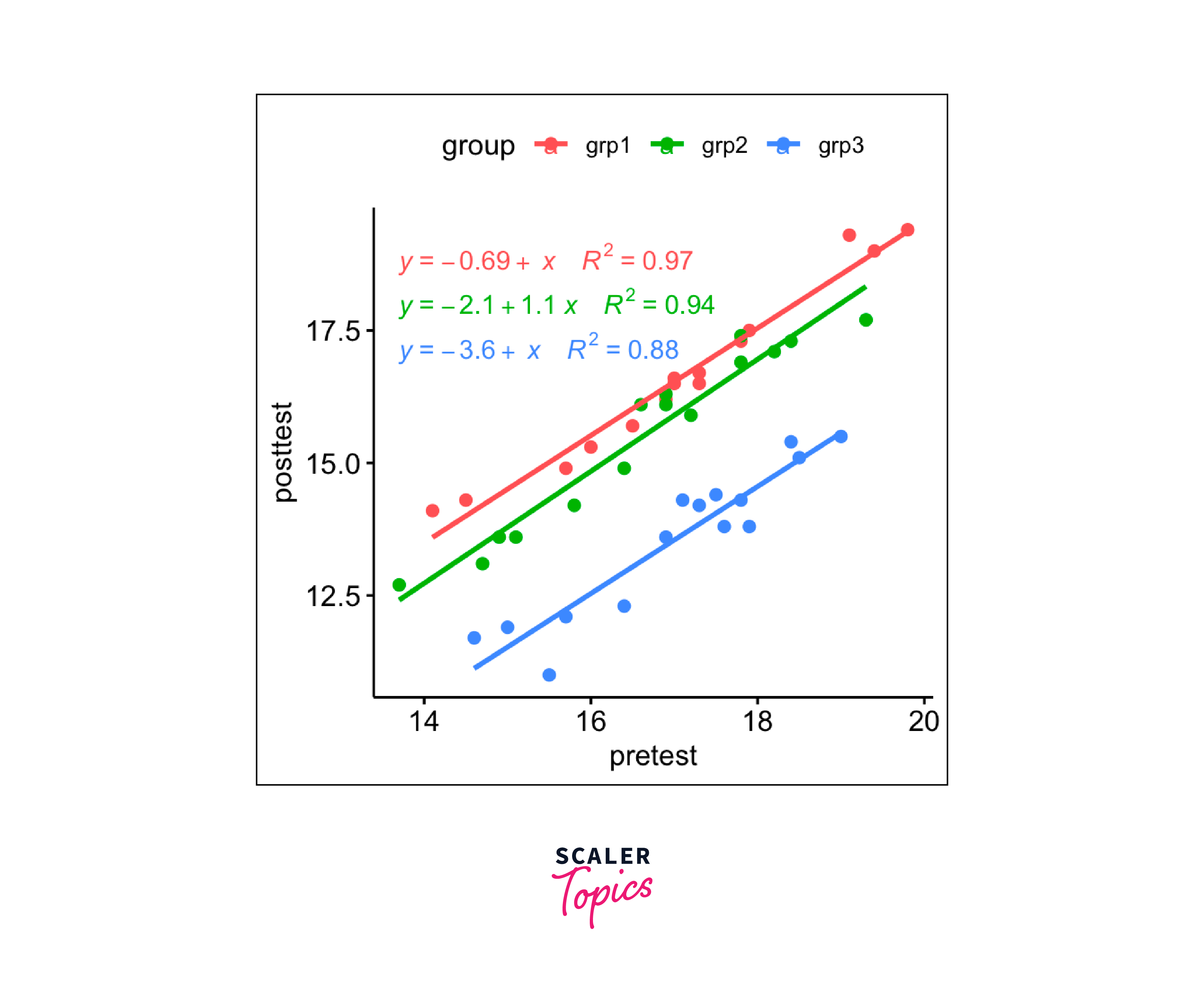 - We then used the lm() function to fit the ANCOVA model. Here, we regressed post_test on teaching_method (categorical factor) and pre_test (continuous covariate).