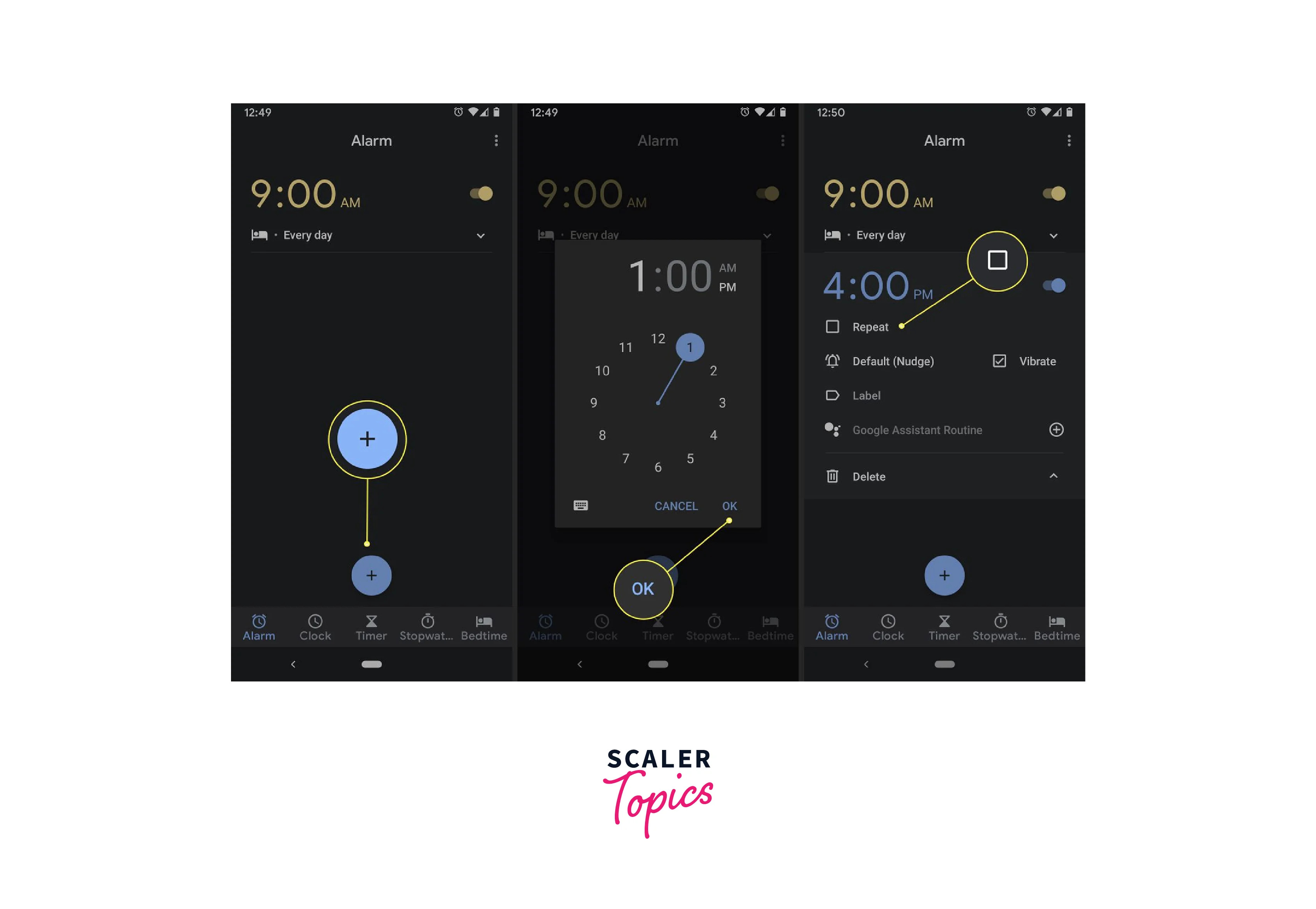- Repeating alarms can be created using the setRepeating() method, providing the alarm type, initial time, interval, and PendingIntent.