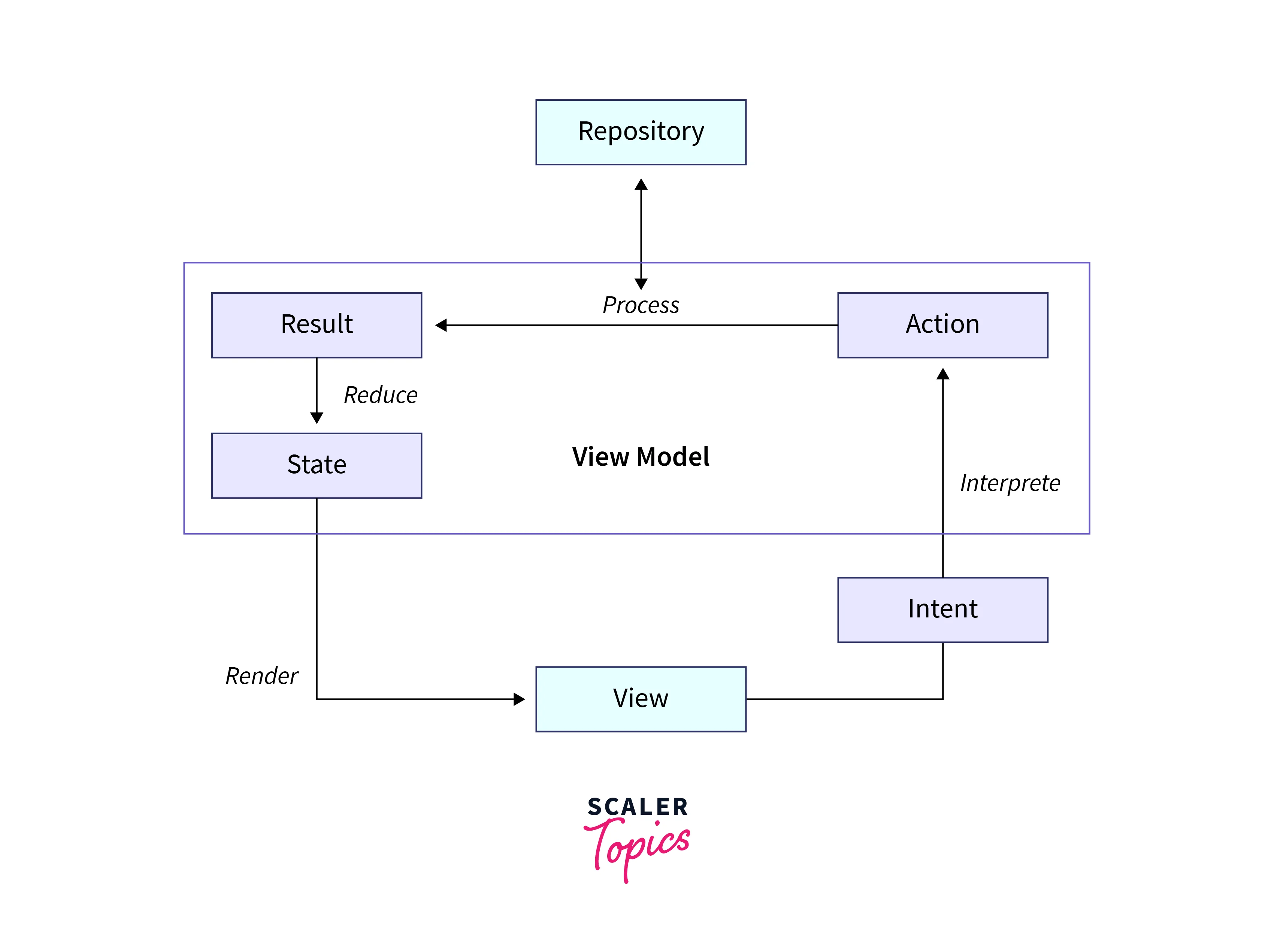 • The Model processes the Intents, performs necessary operations (e.g., data fetching or state updates), and produces a new state.