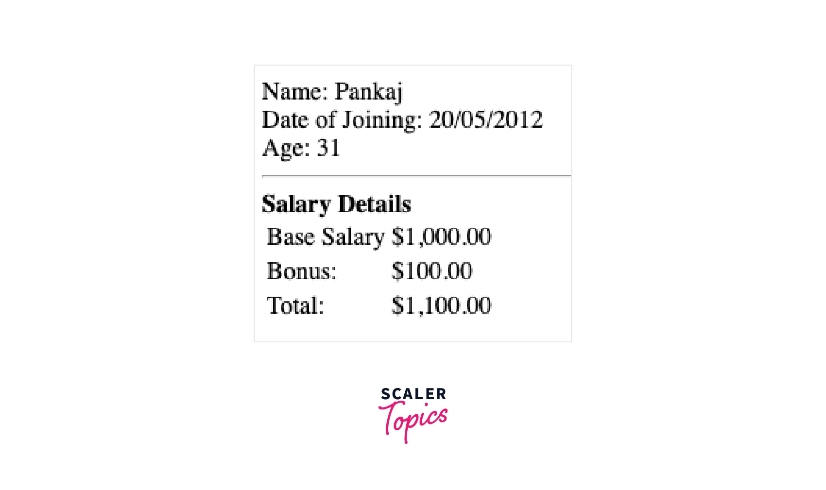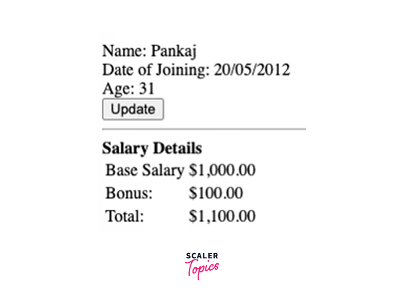 The salary component would be responsible to display the salary details like Employee base + bonus = total salary. The salary component will have salary as the Input property.
