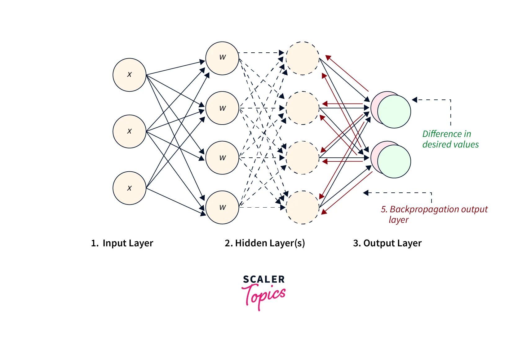 Backpropagation is a technique for training ANNs that involves reducing the difference between the network's anticipated output and actual output by varying the weights of the connections between neurons. The weights of the connections are updated using a mathematical optimization algorithm, such as stochastic gradient descent.