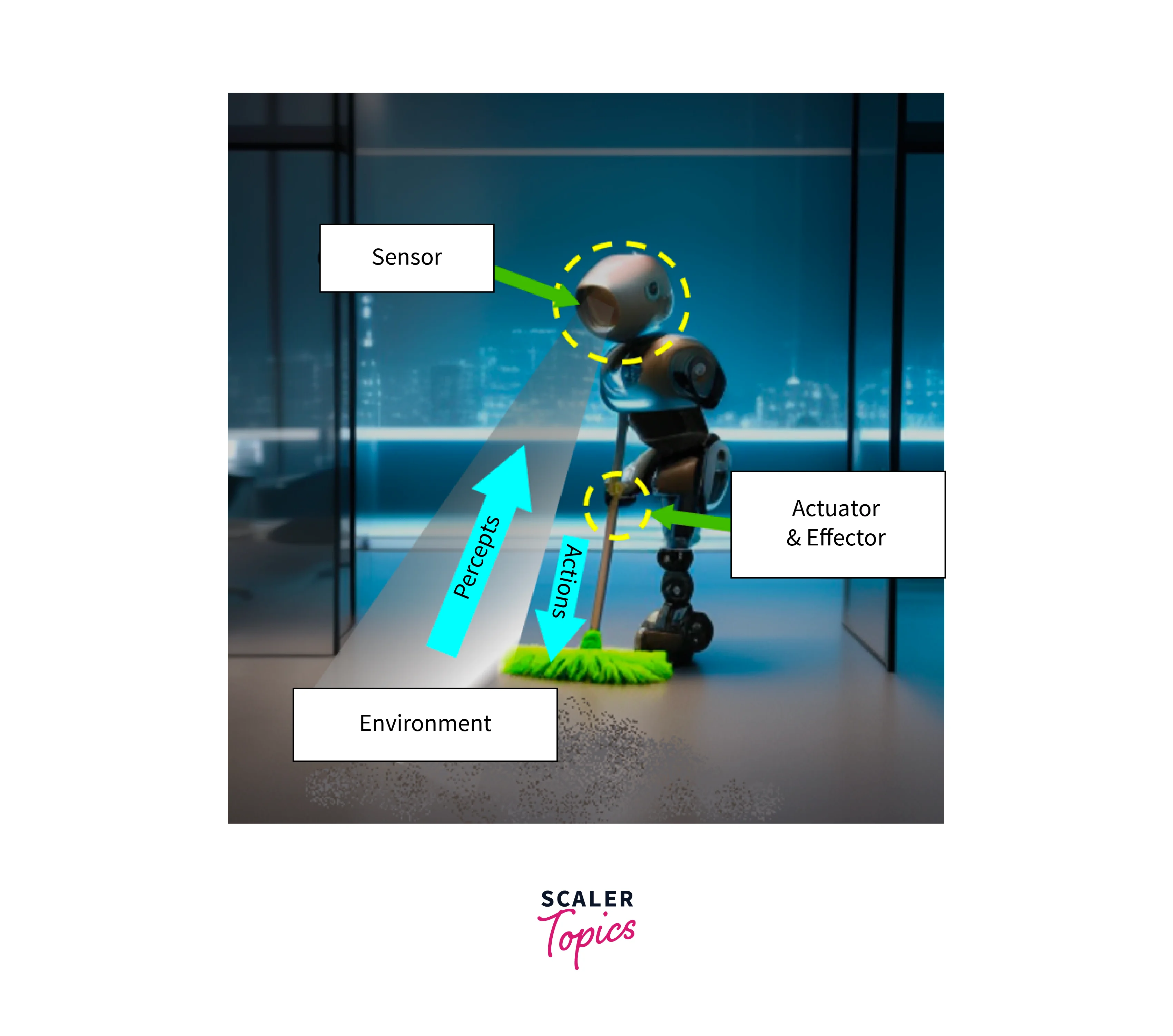 A robotic agent is configured with several sensors to execute tasks in the environment. Cameras are used as sensors, while motors and links work as actuators to perform actions.