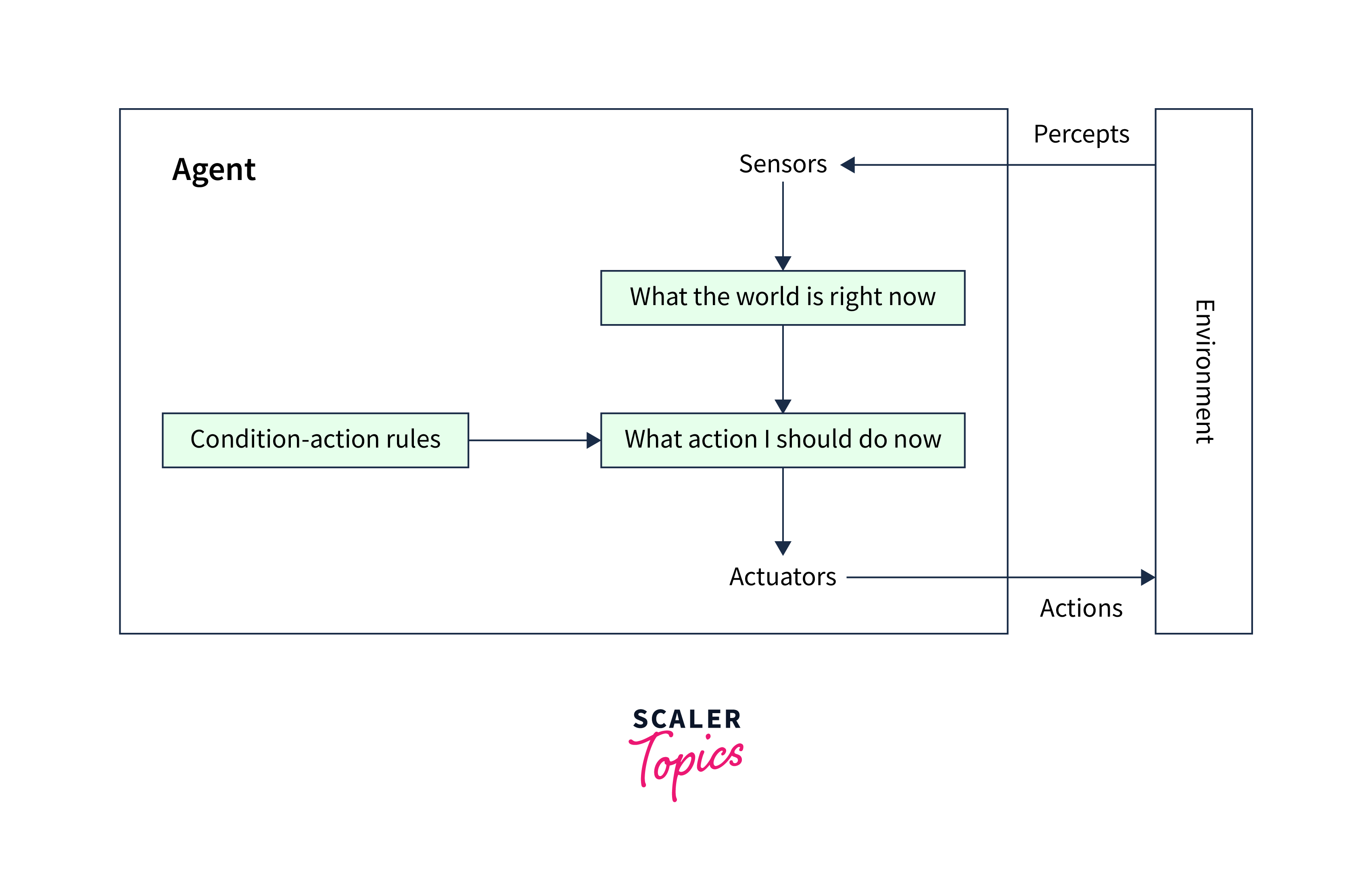 - Simple reflex agents: These agents are memory-less agents, i.e., they make decisions based on the current state of the environment without considering the past or future. They are suitable for simple and reactive tasks that require immediate responses. A typical example of a simple reflex agent is a thermostat that turns the heating on or off based on the current temperature.