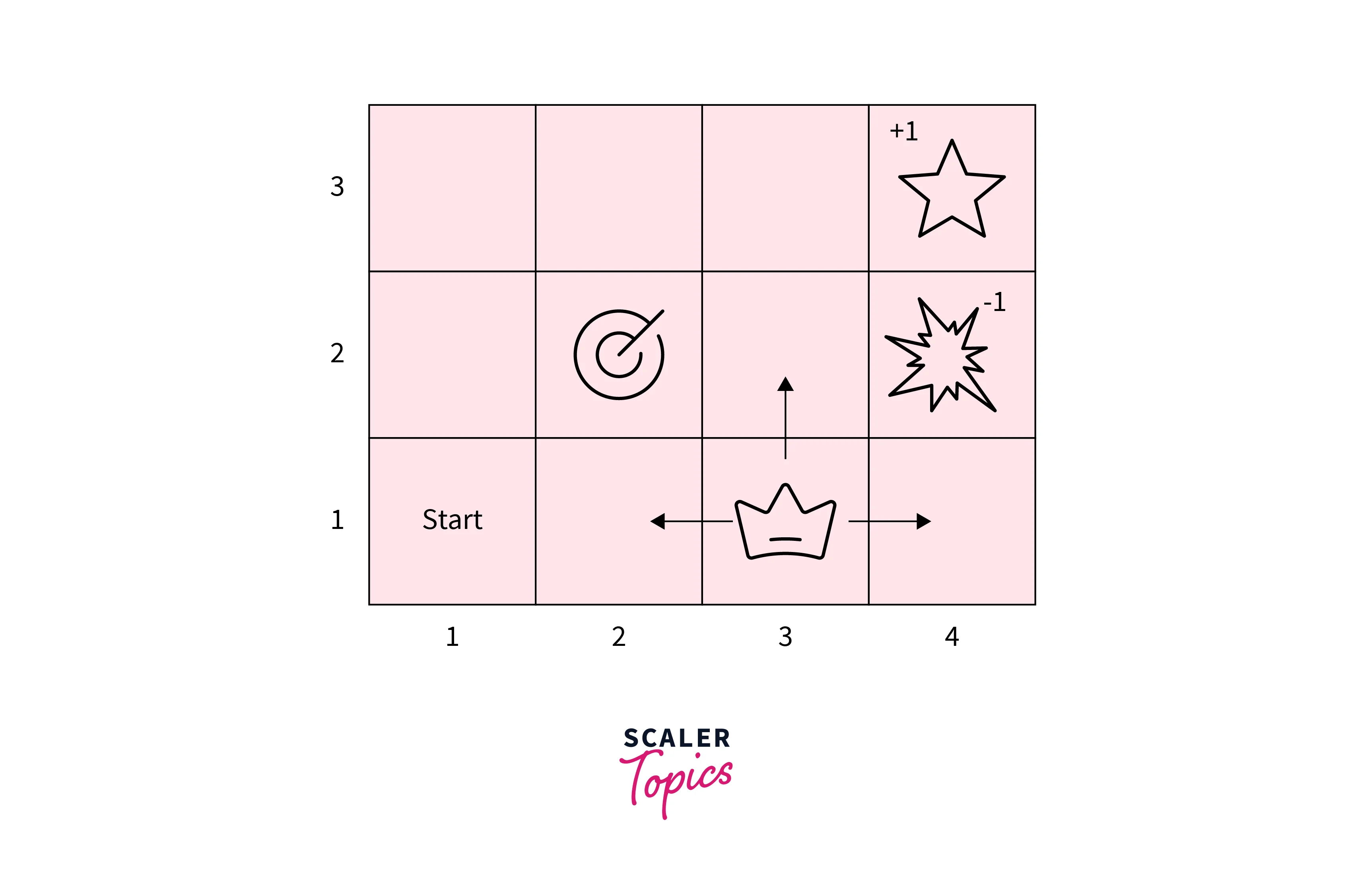 Let us take an example of a Markov Decision Process. There is a grid of size which acts as our environment. The cell represents the START state where the agent stands. The agent's task is to wander in the grid and find the diamond to get a reward of . Naturally, the position of the diamond on the grid is unknown to the agent.