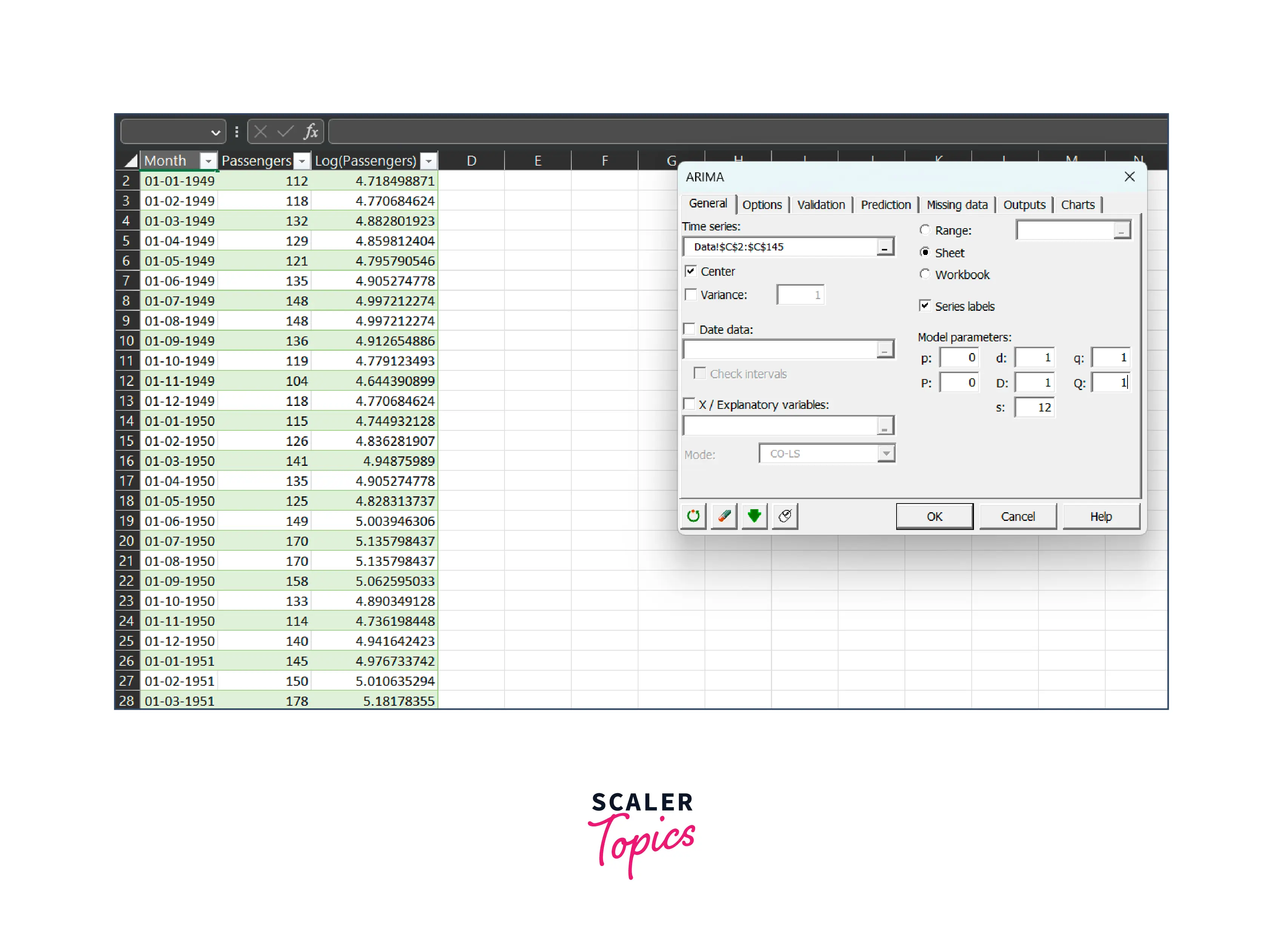 In the Times series field of the ARIMA dialog box that appears, select the Log(Passengers) data from your Excel sheet.