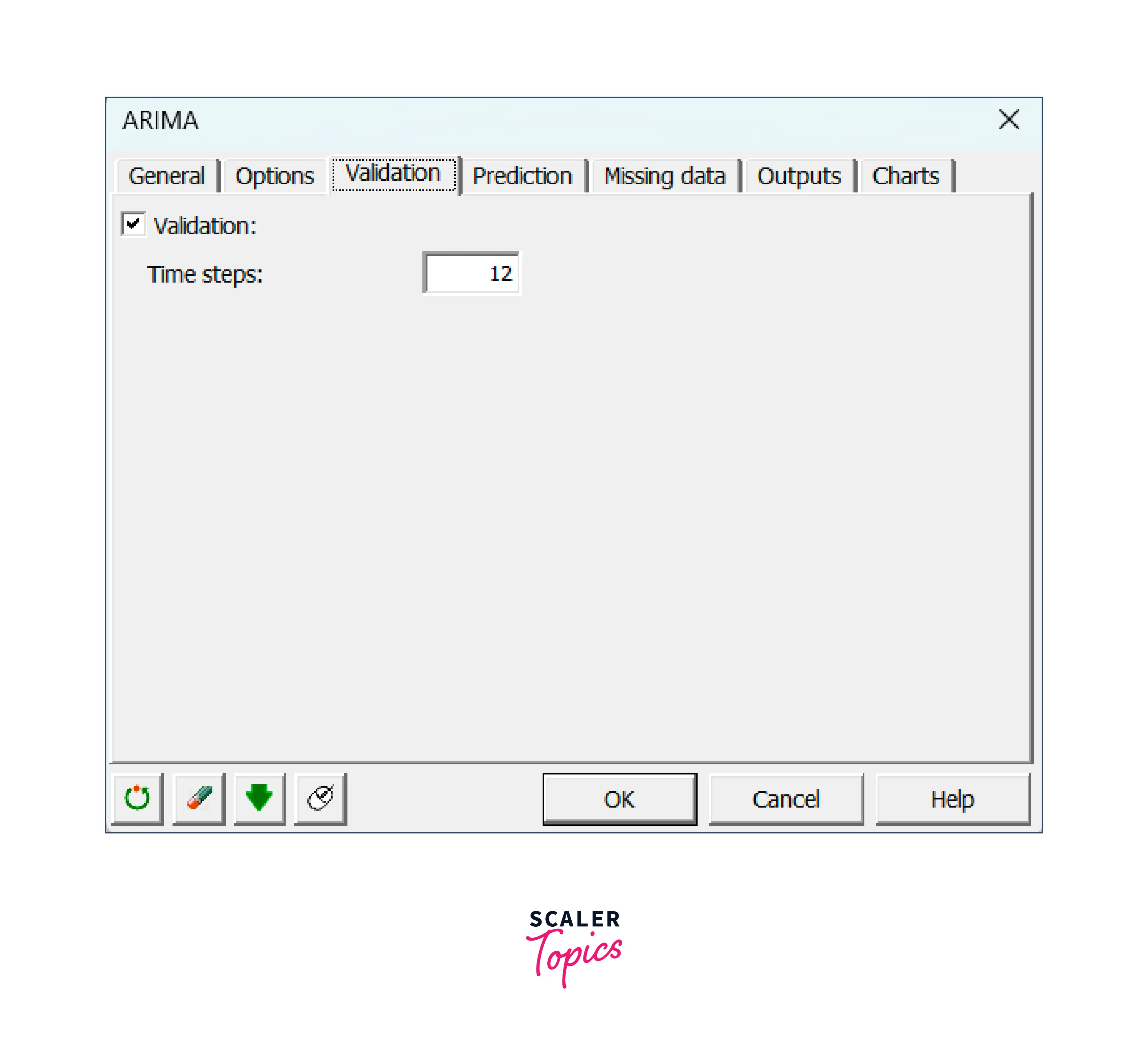 In the validation tab, enter 12 to exclude the last 12 values from model fitting and use them only for validation purposes.