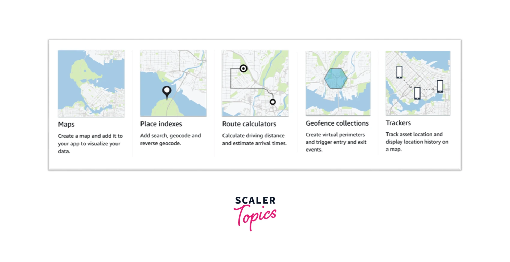 - A range of services are offered by Amazon Location. Maps, Places, Routing, Geofences, and Tracking of the developer's applications are among these.