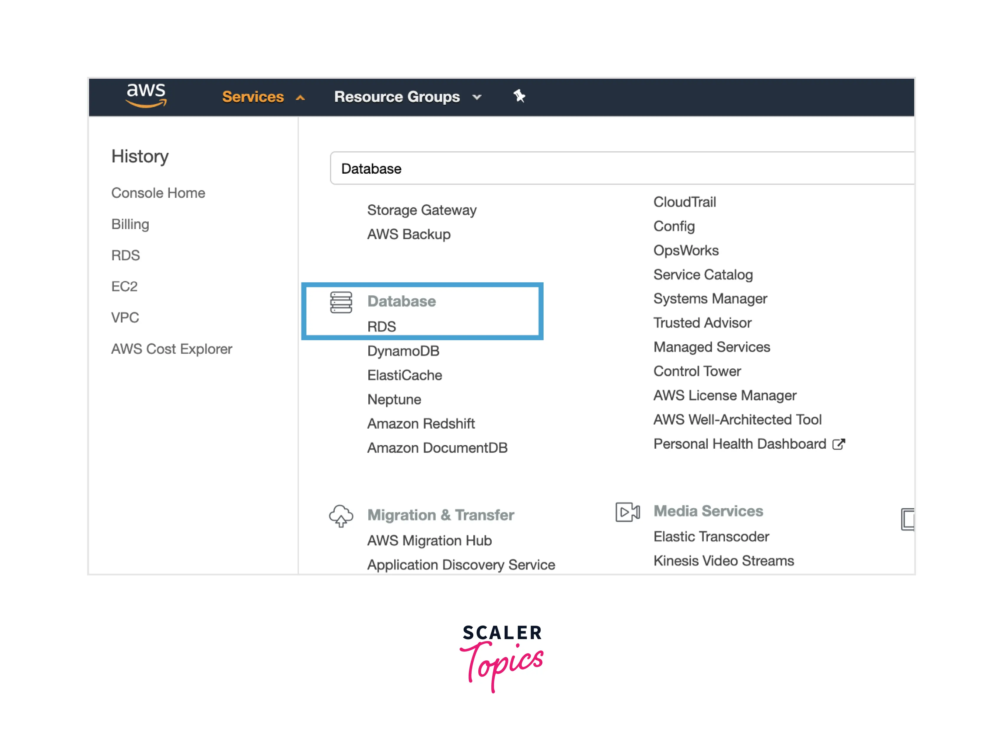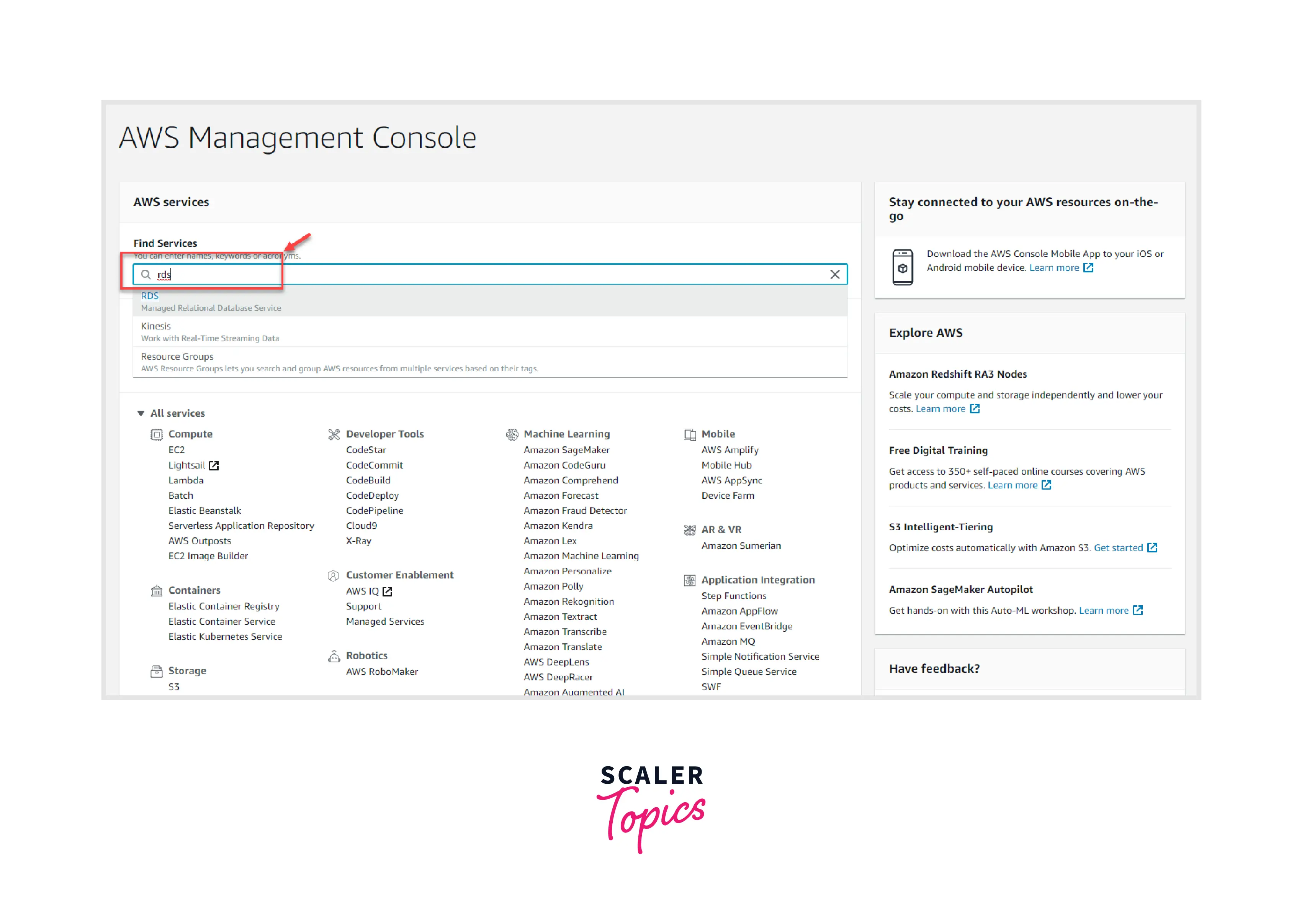 STEP 1: Let's first create an AWS Account before establishing the RDS MySQL Environment. Once the AWS account has been properly created, type RDS into the Find Services bar and press Enter.