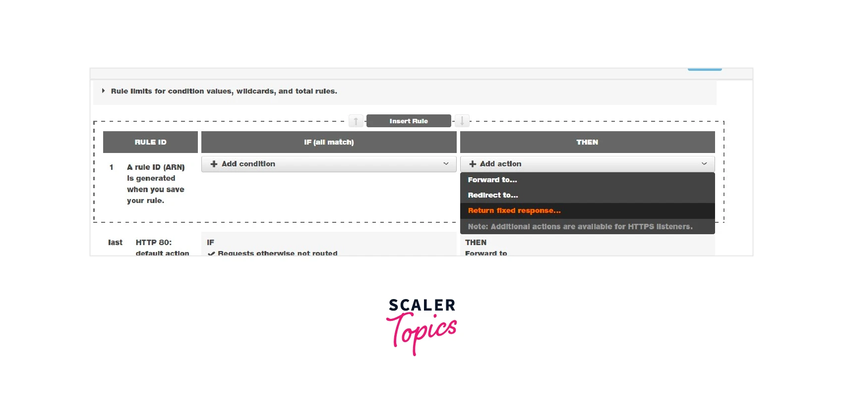 | Fixed Return response | If the request is received, the AWS application load balancer will return the fixed HTTP code response |