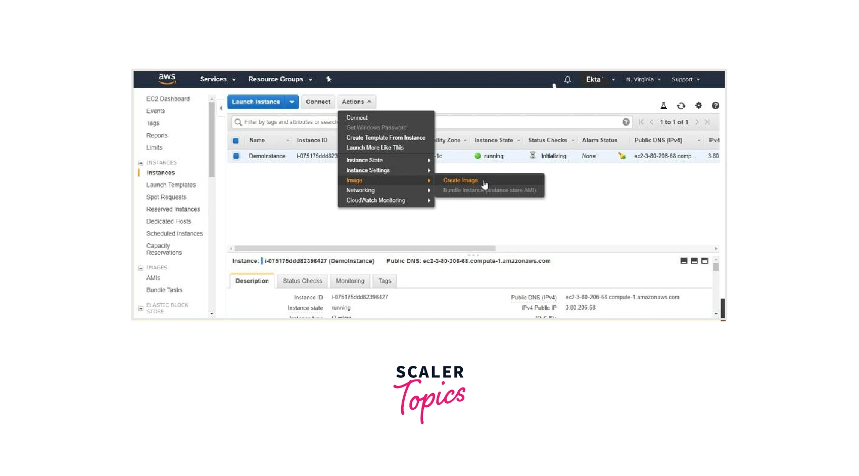 Step 1: From your running instances, select the instance for which you want to create an AMI. Then, select Actions > Image > Create Image from the menu.