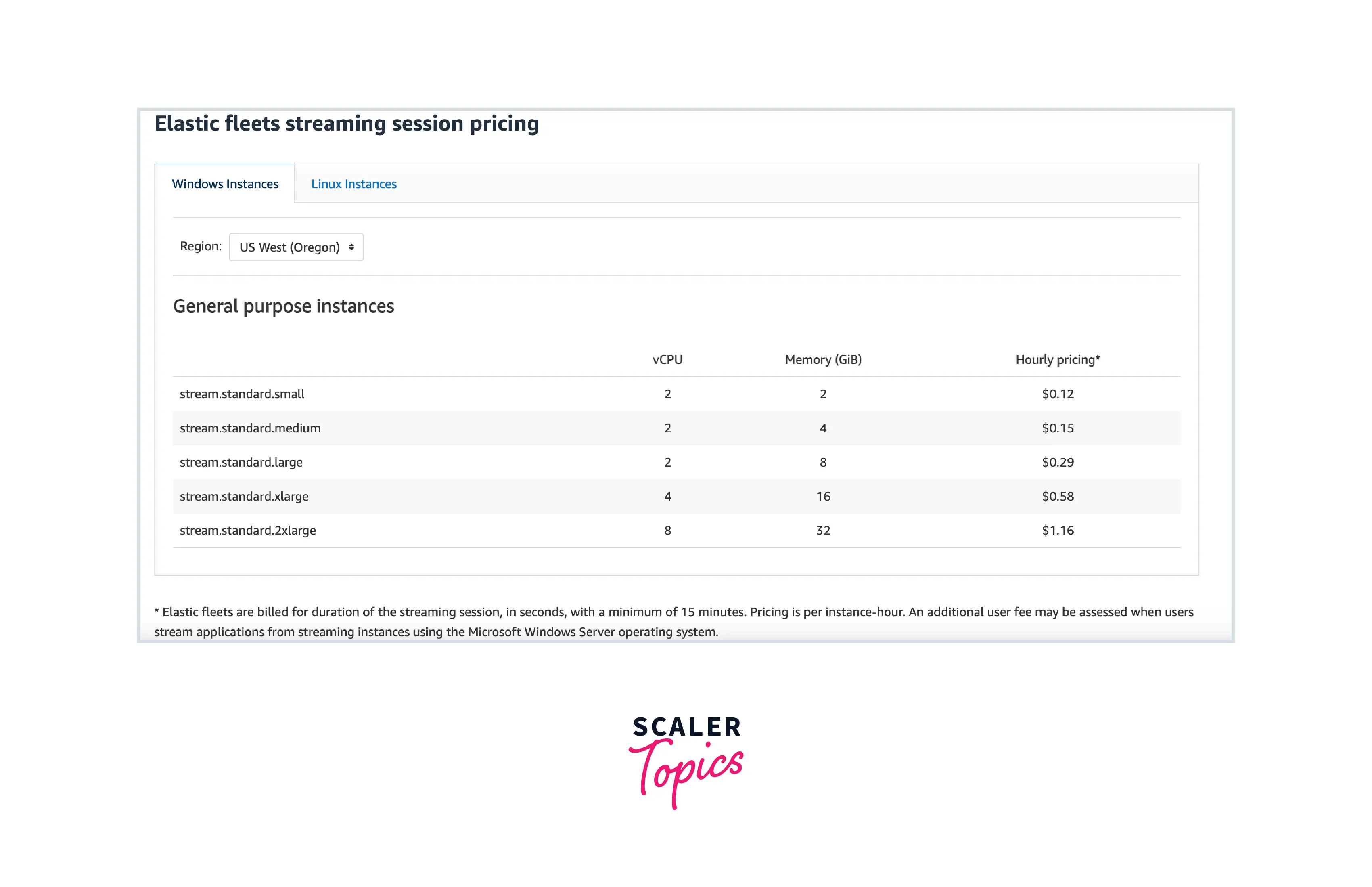 Charged hourly for Windows Elastic fleet instances whereas charged on one-second increments( a minimum of 15 minutes) for Linux Elastic fleet instances. Also, the pricing is per instance-hour.The below image shows the pricing structure for the Elastic fleet streaming session pricing structure :