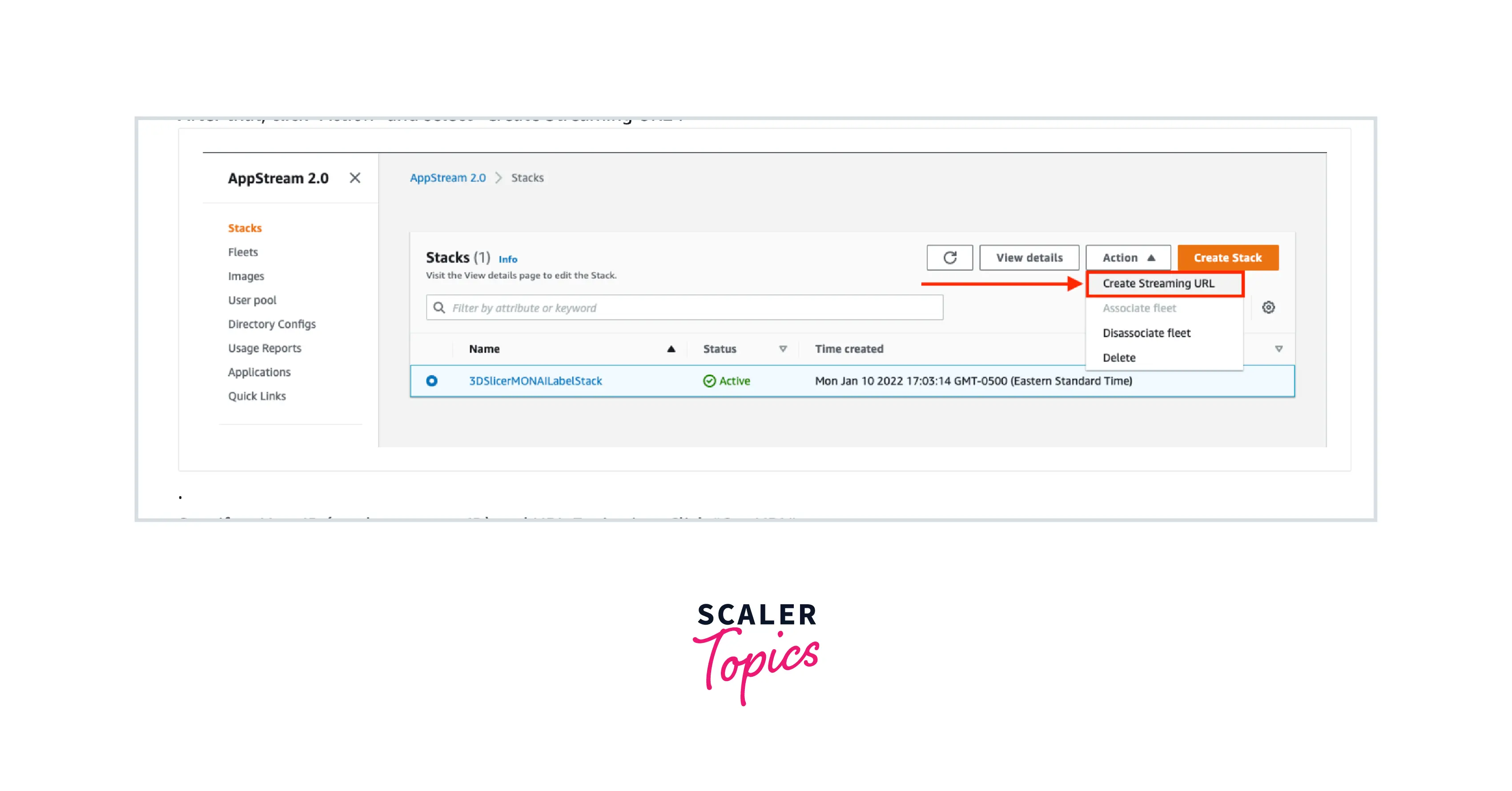 Now select 'Stacks' from the navigation pane and select the designated stack. Select the 'Actions' button and go ahead to create the 'Streaming URL' as shown below.