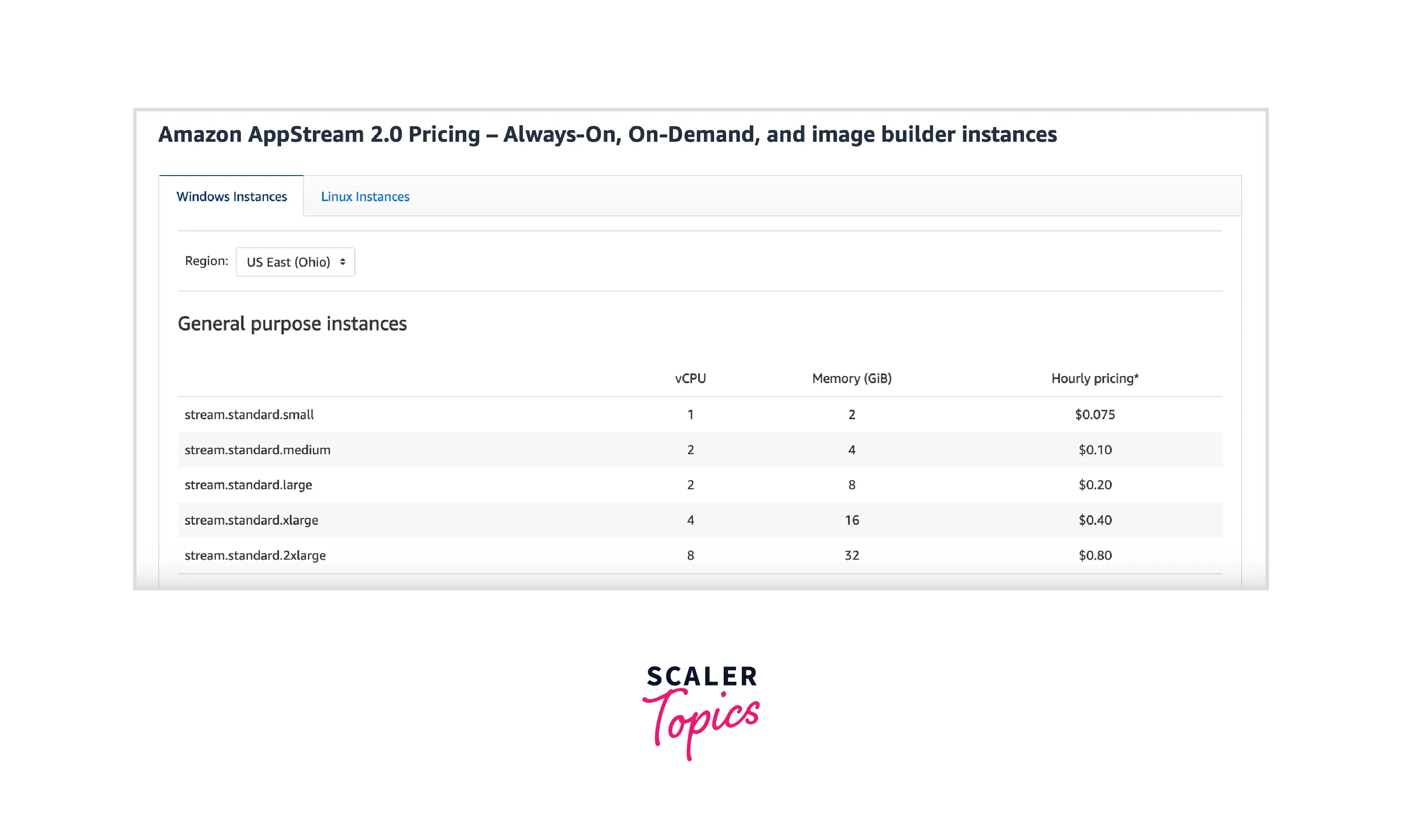 The pricing structure for the above instances isis based on the instance size, type, and operating system selected. Also, the instance charge includes storage, computing, as well as any network traffic utilized by the streaming protocol.
