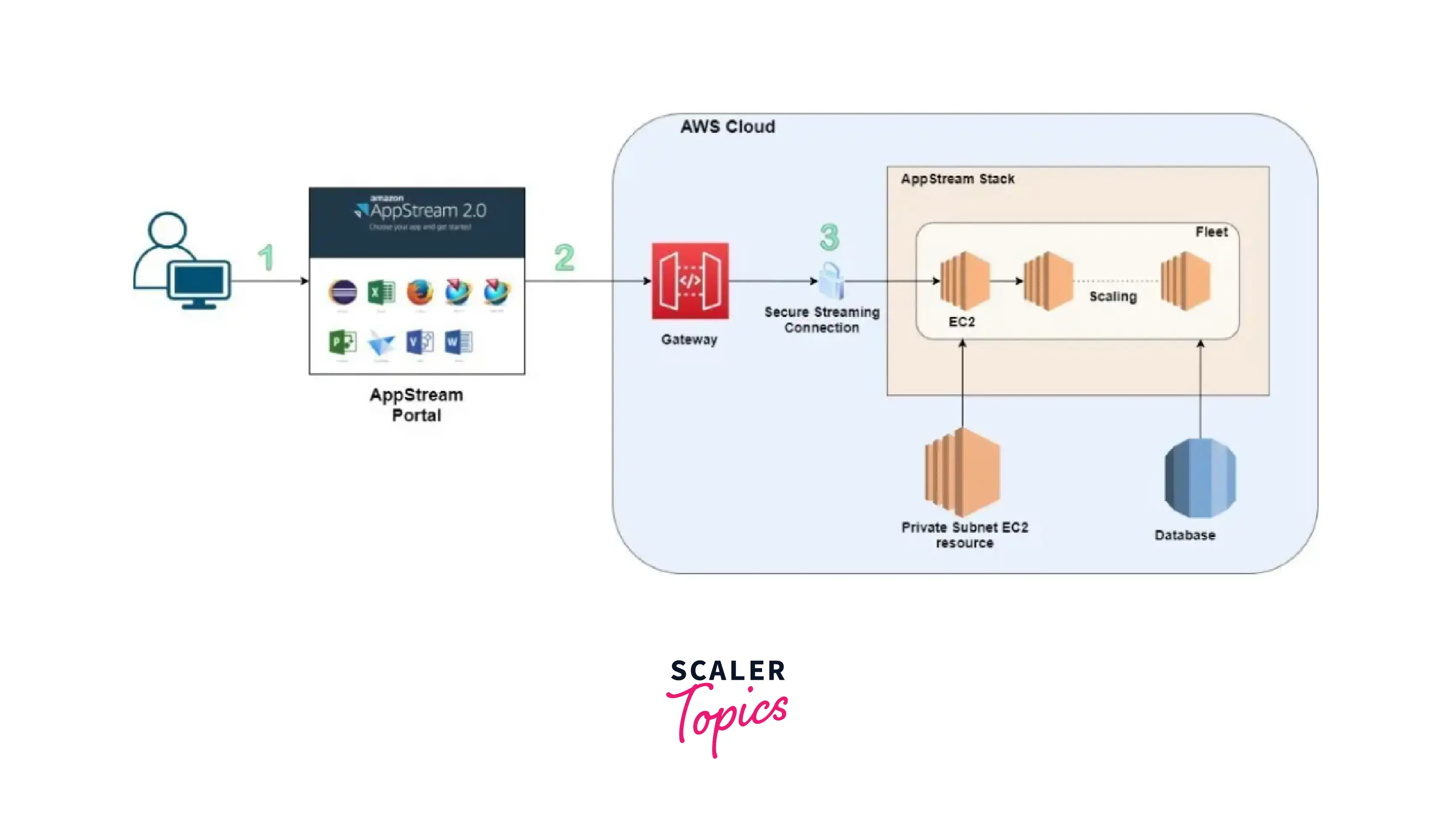 - Each distinct user connecting to the AWS AppStream portal, is allocated a dedicated EC2 machine as well a secure, reliable connection is established between the two. After this, AWS manages all the scaling for the virtual machine fleet as the number of users accessing the Amazon appstream portal increases.
