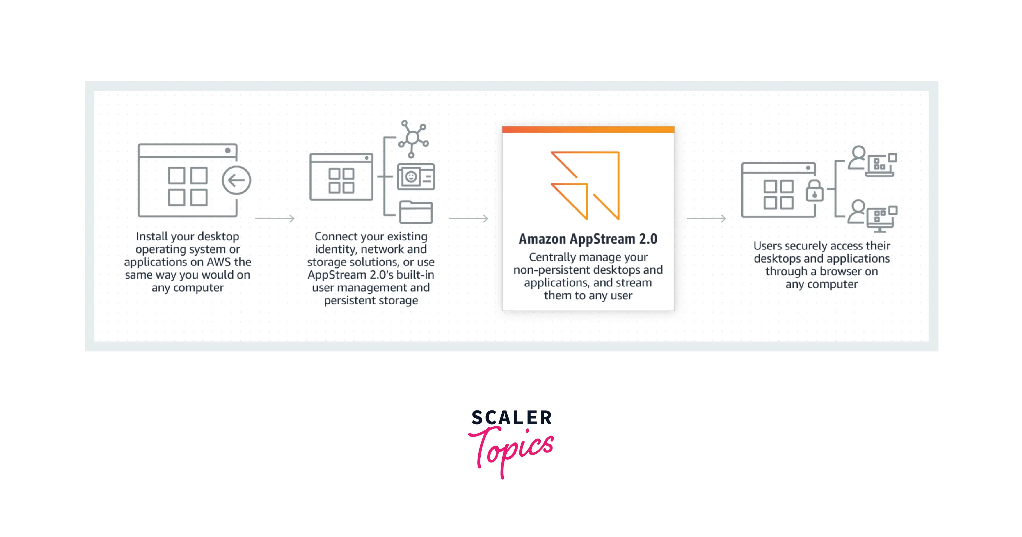 The working of AWS Appstream starts by simply installing the applications or the desktop operating systems on AWS the same way you shall do on any Windows computer. Then you need to connect the existing identity, network as well as storage either on-premises or on AWS. For this, you can also use the AWS AppStream 2.0 built-in user management and persistent storage.