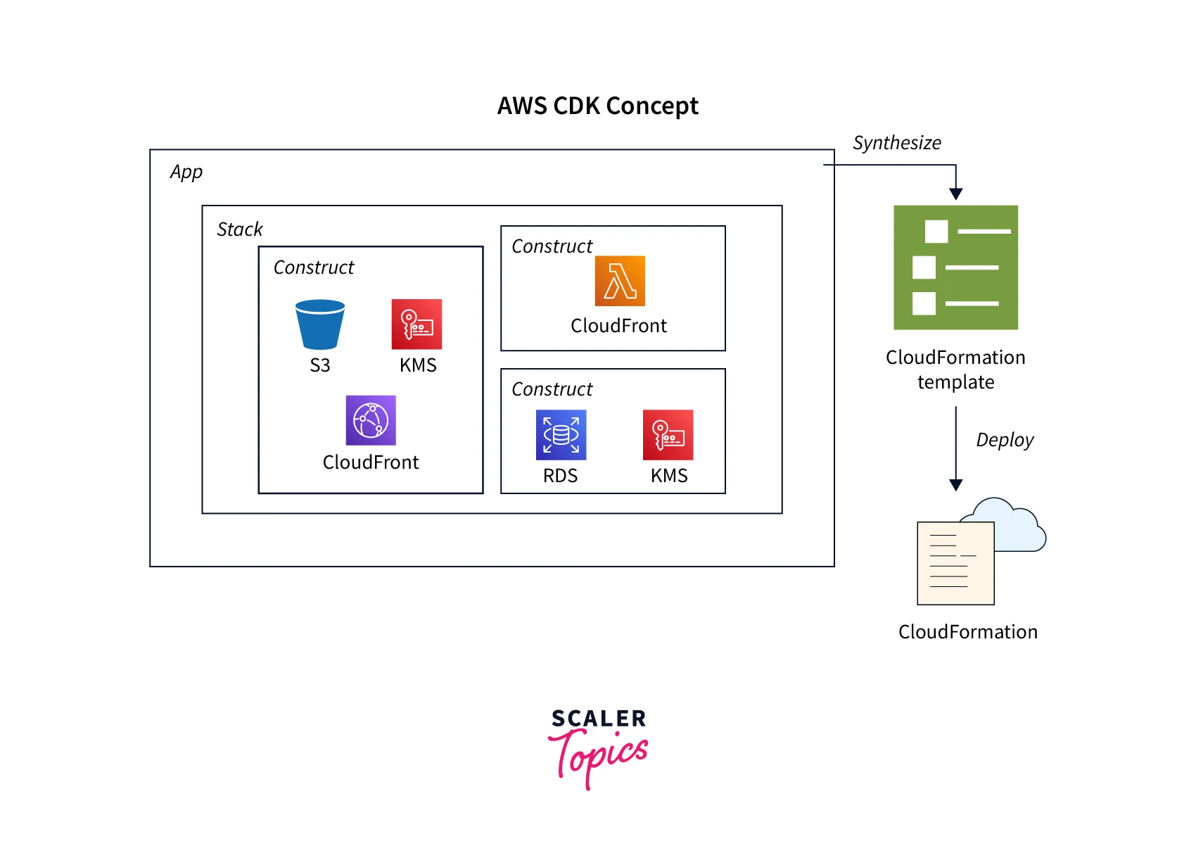 One of the most important components of AWS CDK is the AWS CDK constructs which are referred to as the high-level components that capture all the important configuration detail along with the glue logic offer a range of constructs for commonly used AWS services and features. These are customizable constructs that based on your needs can be reused by changing parameters in the code. These AWS CDK objects are initialized and compiled as a YAML template which can later be deployed as an AWS CloudFormation stack.