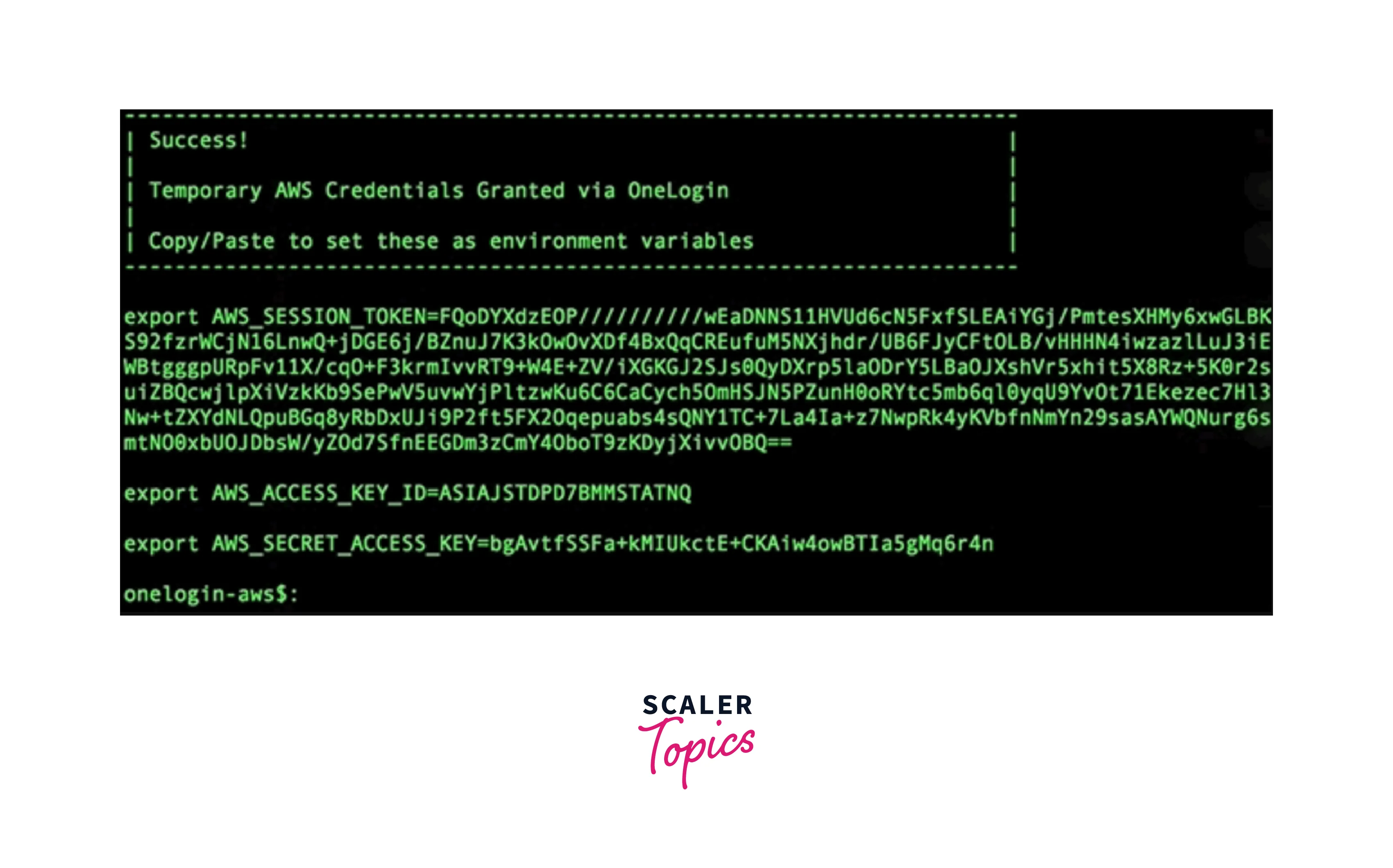 The command's output includes an access key, secret key, and session token that you can use to log in to AWS: