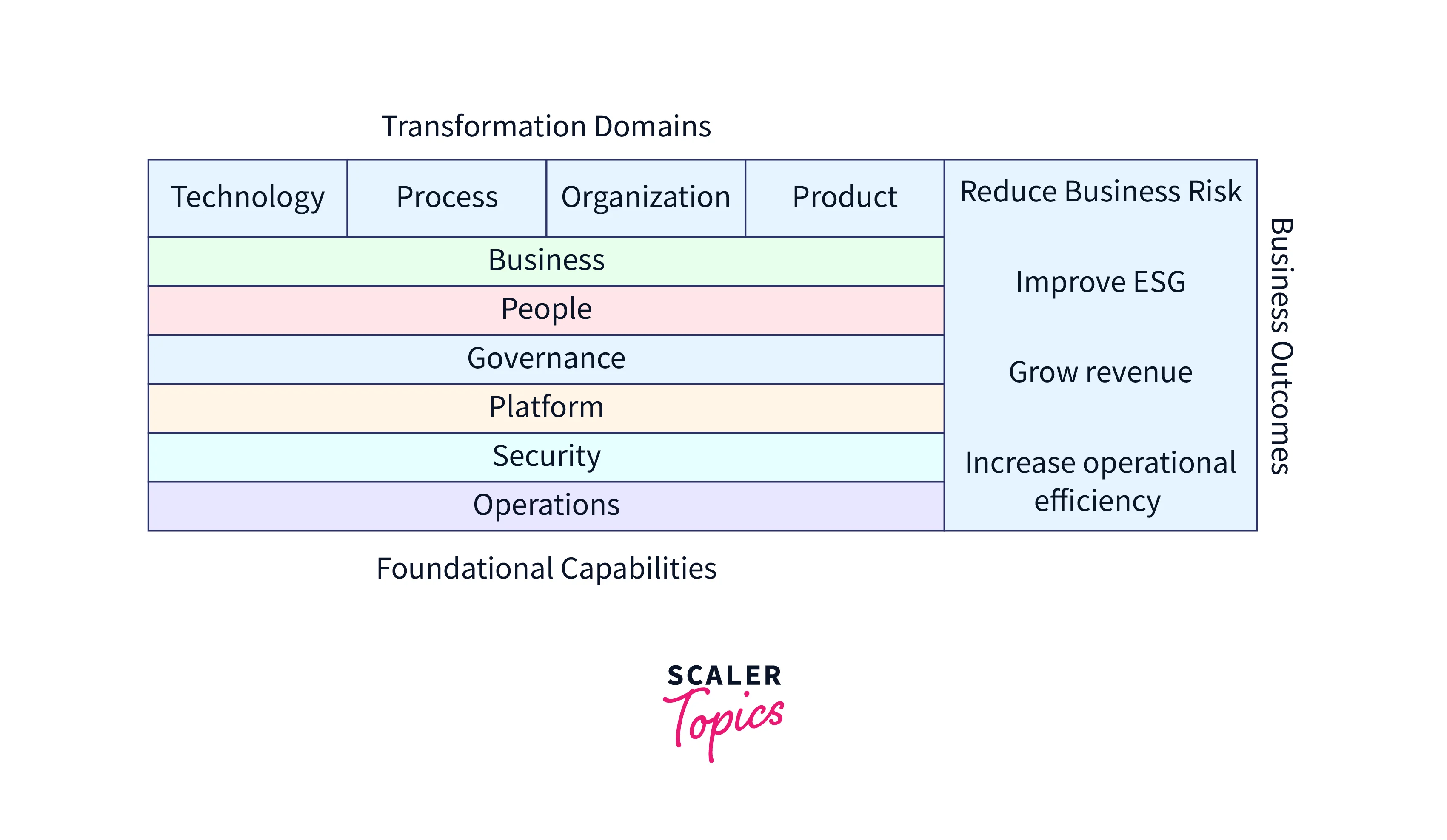The following diagram illustrates how the cloud-powered organizational change (transformation) made possible by a set of fundamental capabilities speeds up business outcomes. The transformation domains depict a value chain in which technological change enables process change, allowing organizational change, which permits product change. The essential business benefits are reduced company risk, enhanced environmental, social, and governance (ESG) performance, and more significant revenue and operational efficiency.