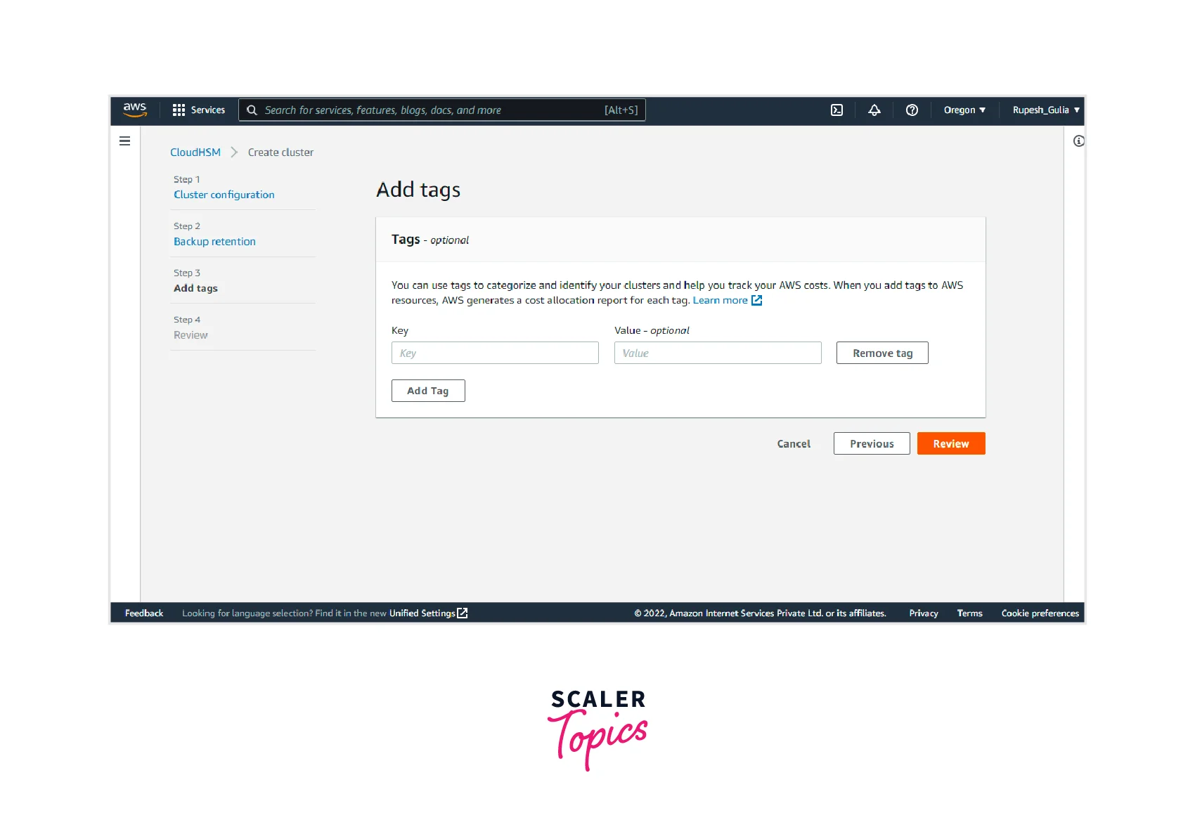 - Step 3: Now, you can add any tags if needed (as it is optional), which you can use to categorize and identify your clusters and help track your AWS costs. Click on the "REVIEW" button.