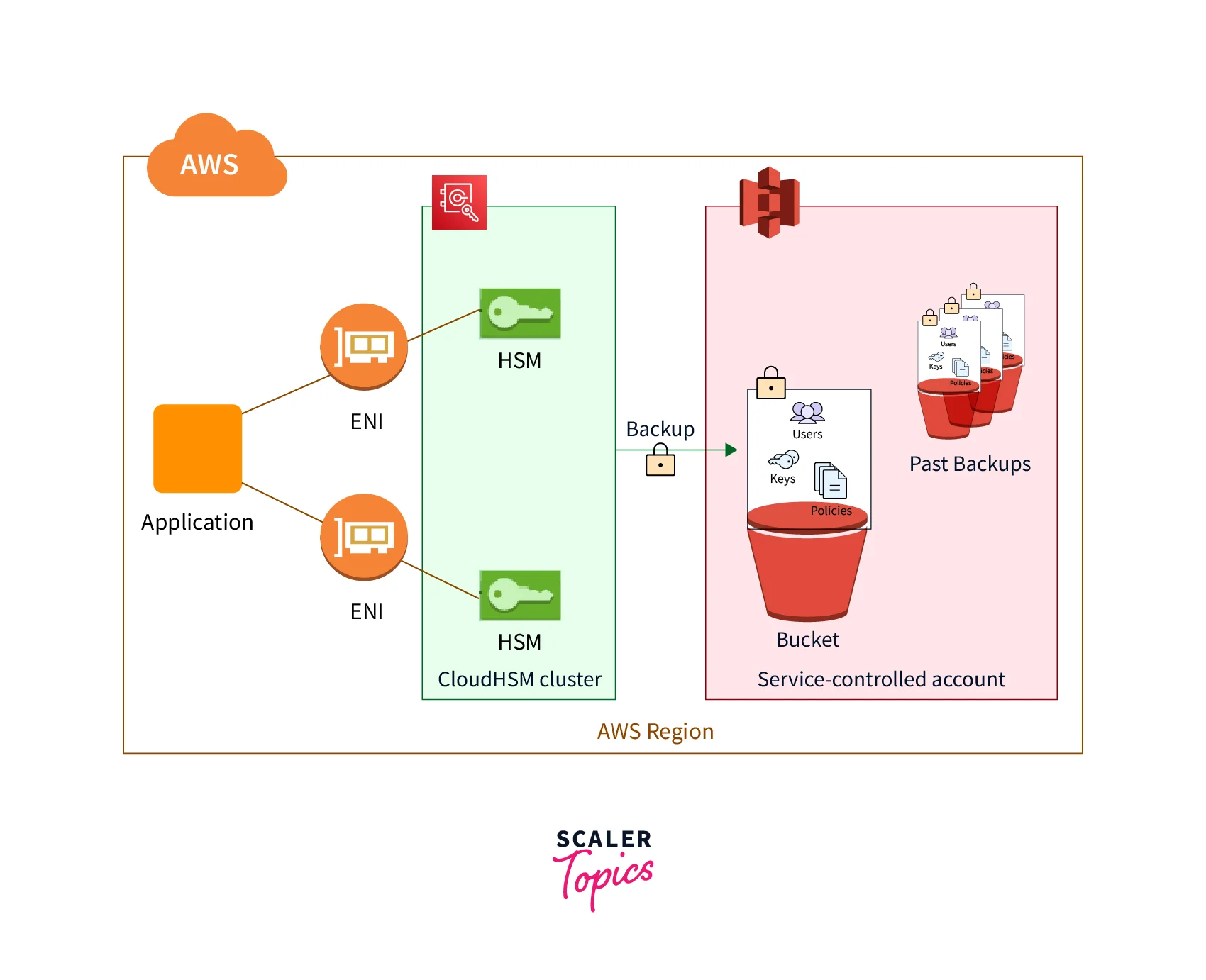 AWS CloudHSM performs regular backups of the cluster's users, keys, and rules. Backups are stored in the same region as your cluster in a service-controlled Amazon S3 bucket. The above diagram depicts your backups' link to the cluster. Backups are safe, long-lasting, and updated regularly.