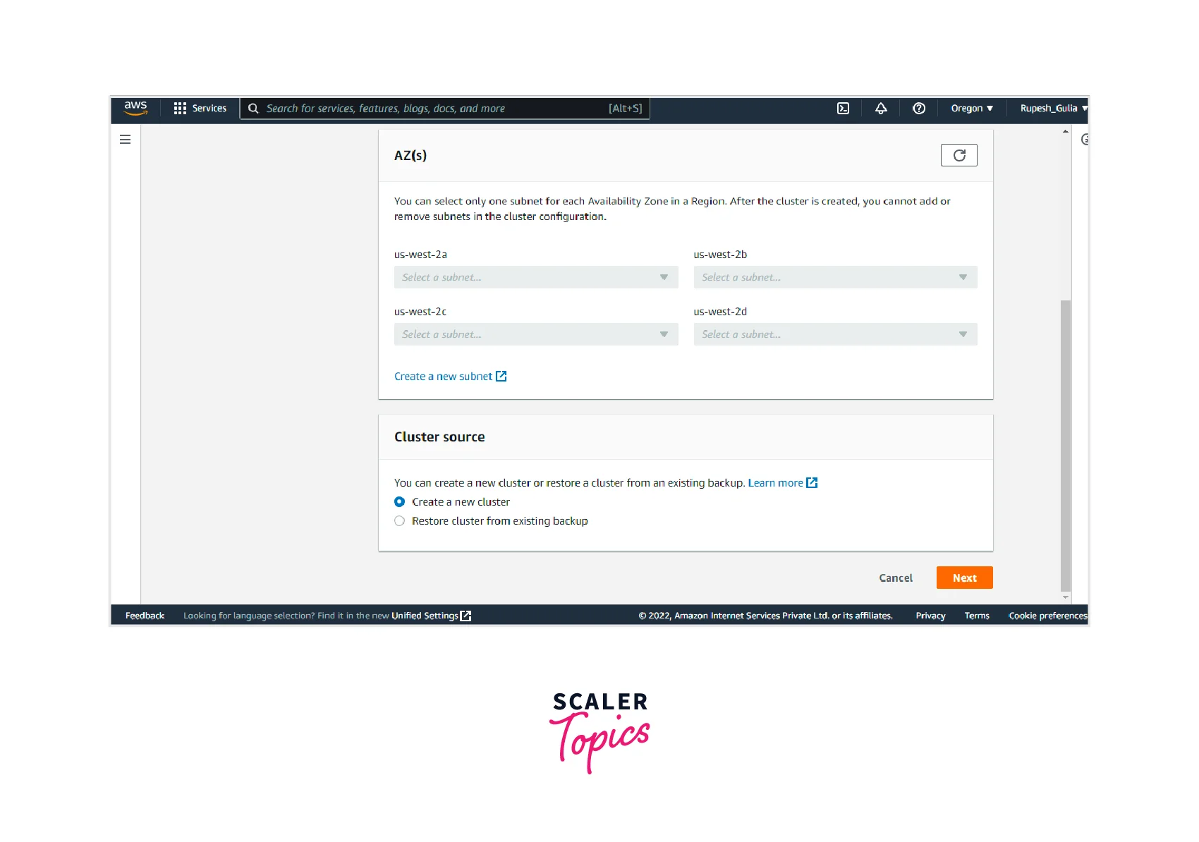 - Step 1: Now, you have to provide the VPC. Here we have selected the default VPC. Then you can provide the subnets from the various AZ. After that, you can specify the cluster source(new (or) existing). Click on the Next button.