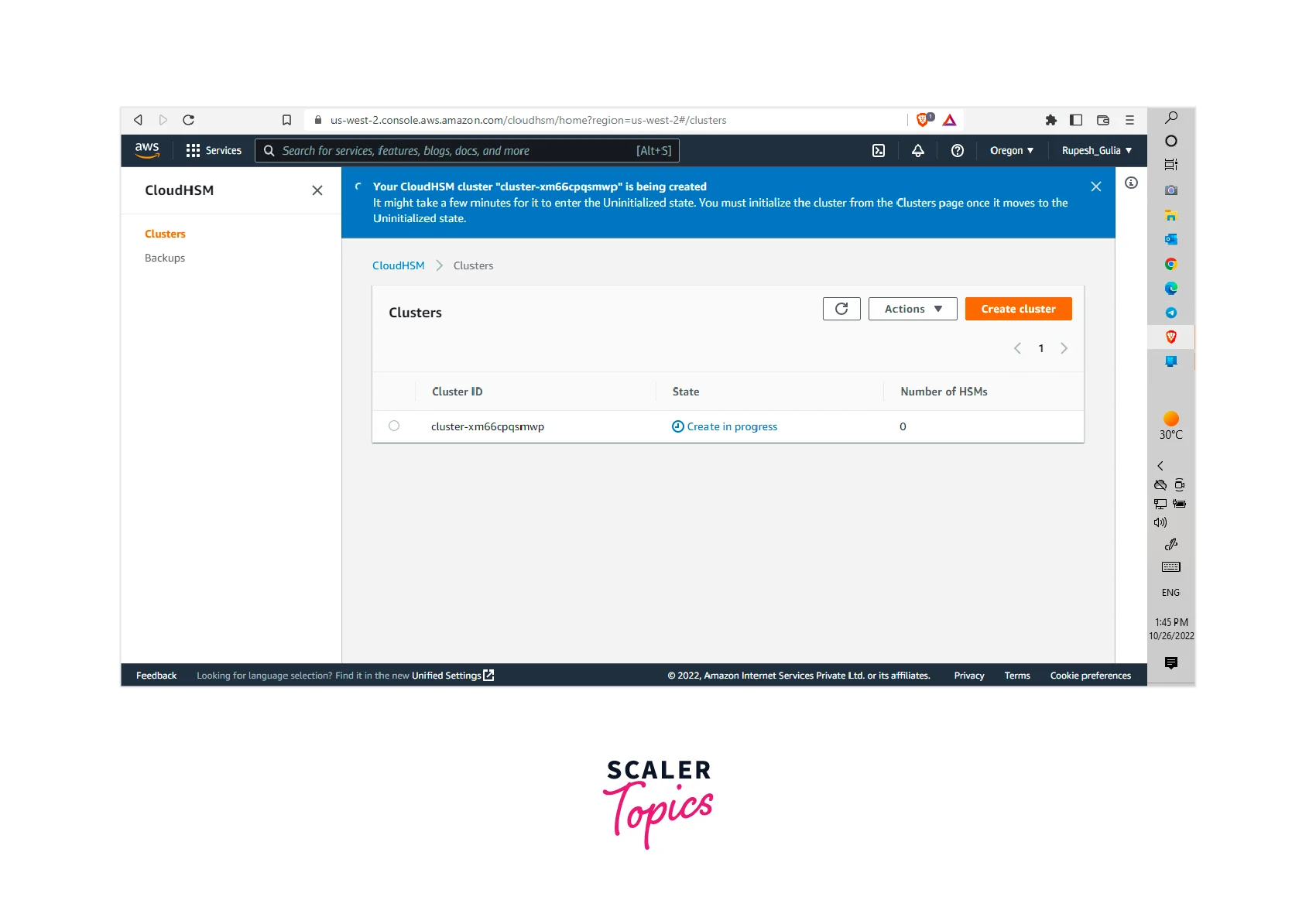 - First, open AWS CloudHSM from the AWS management console to get started. Now, click on the create cluster button, as shown below, to create a cluster.