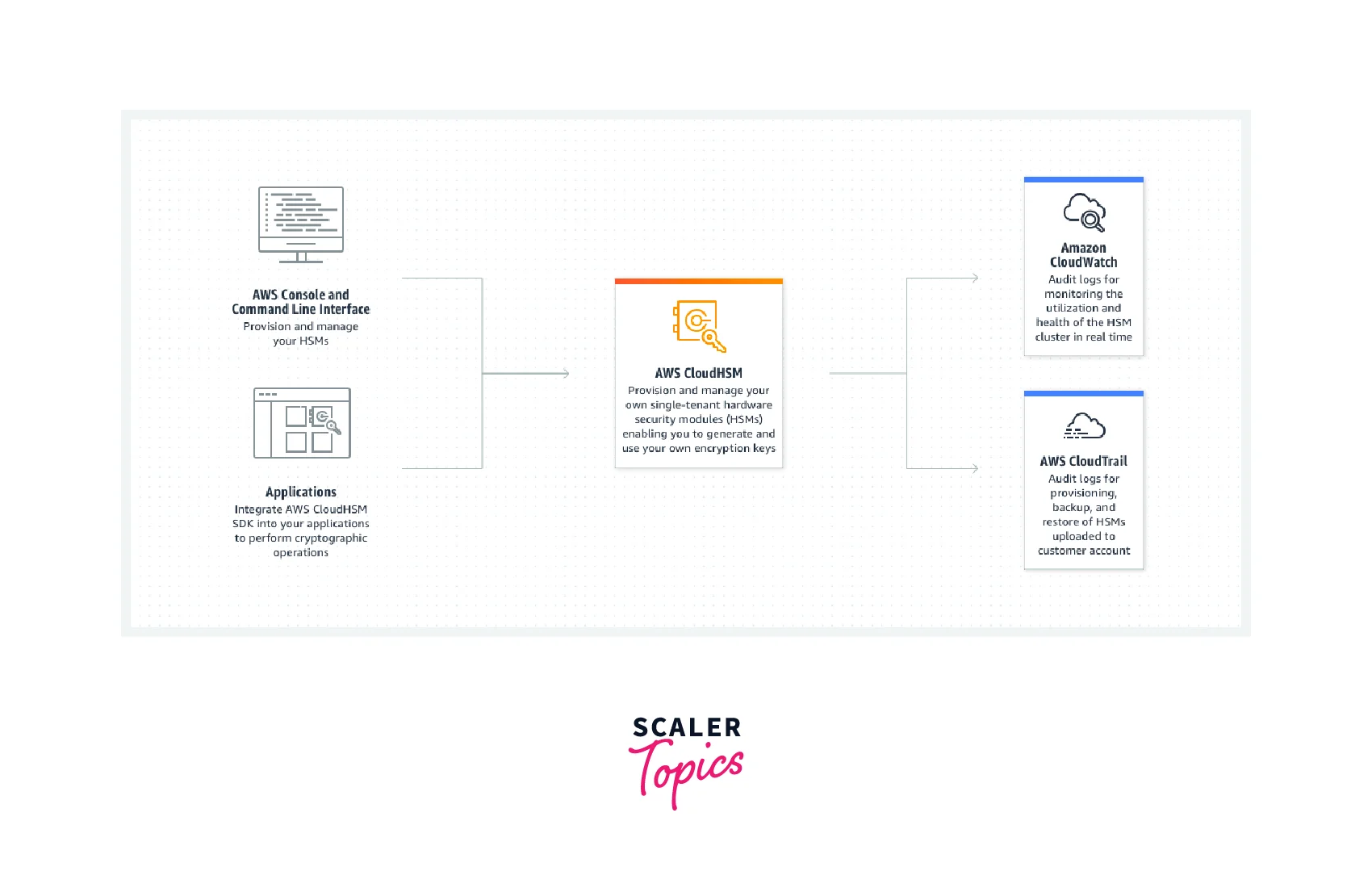 - AWS CloudHSM includes key concepts namely Clusters, Backups, HSM Users, Keys, CLI tools, etc.