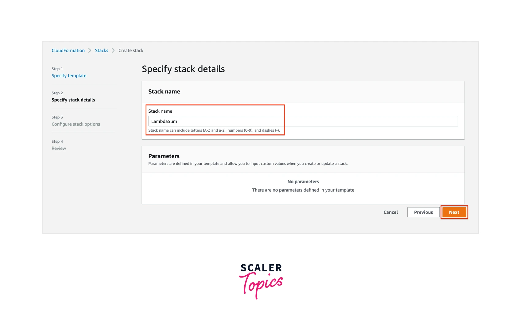 - In the "Specify stack details" page, add "LambdaSum" as the "Stack name", and then click the Next button.