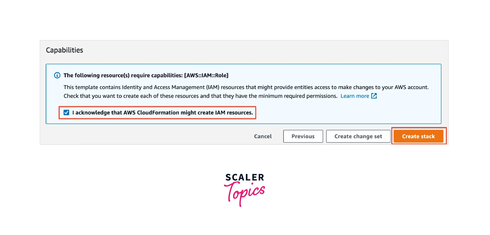 - In the "Review" page, scroll to the bottom of the page and select the acknowledgment. Then, click the Create stack button.