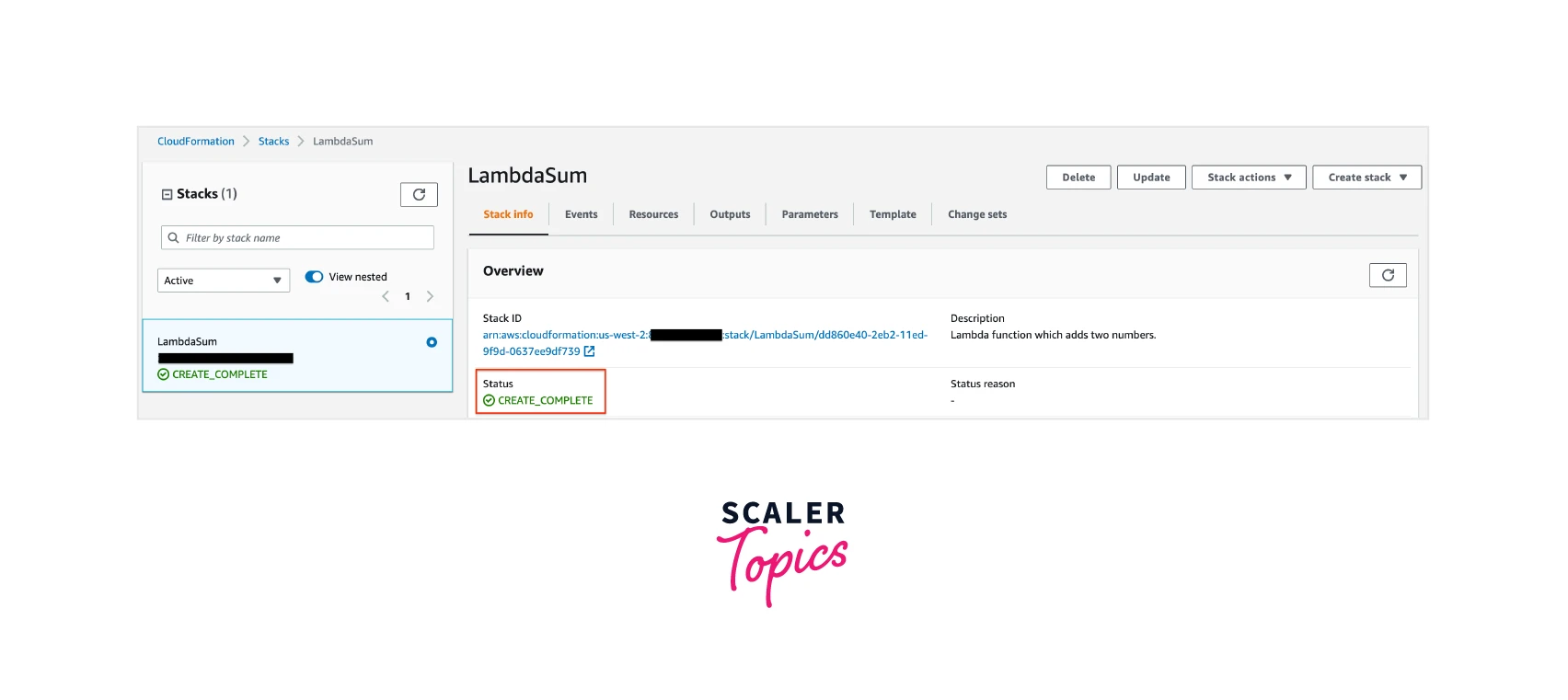 - After a few minutes go to the CloudFormation page in AWS Console and select the LambdaSum stack. You see the "Status" as CREATE_COMPLETE.