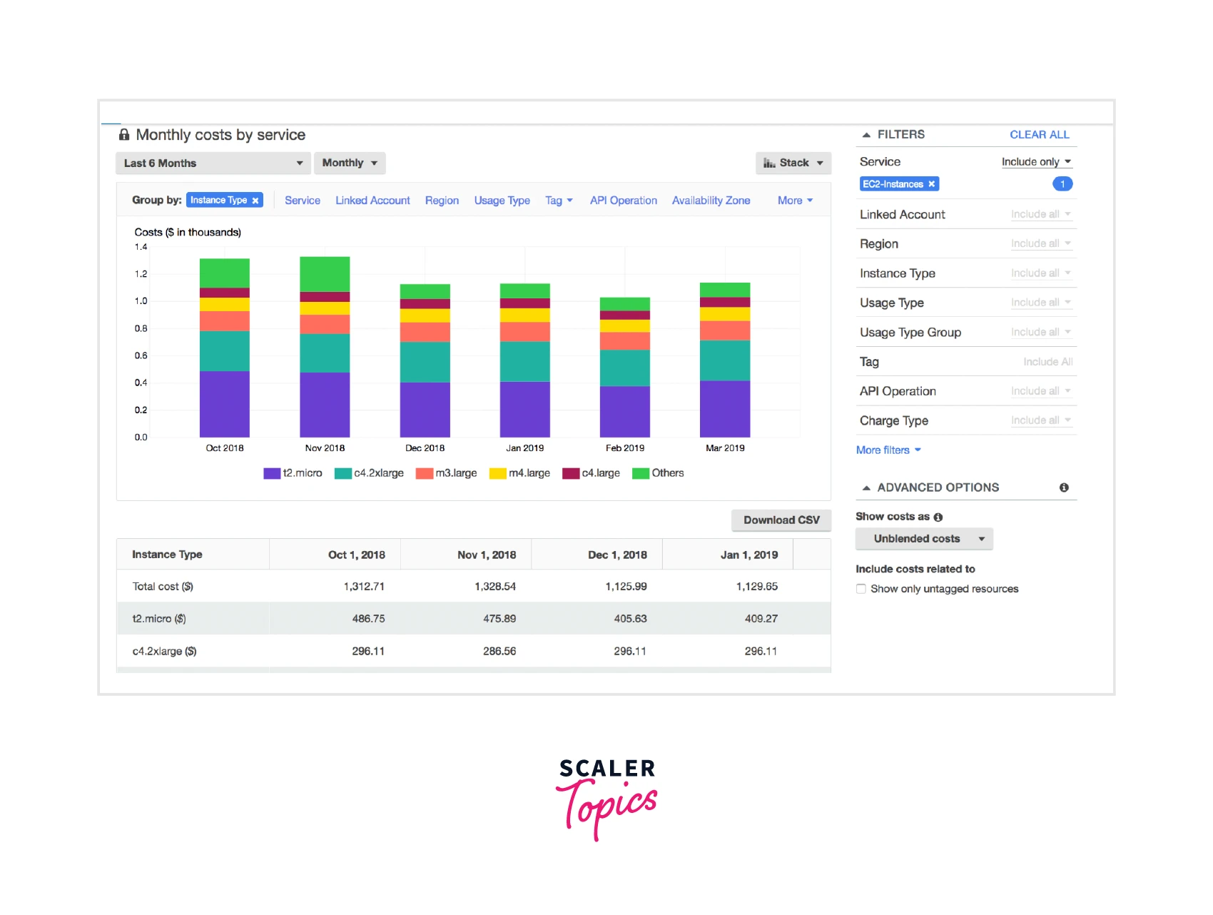 Monthly Cost Incurred by AWS Service With default report that we create with AWS Cost Explorer helps the users to visualize the costs incurred and data usage linked with the top five cost-accruing AWS services along with a detailed breakdown in the tabular view. With these reports, we can time range and view historical data from the past twelve months to understand the cost trends.