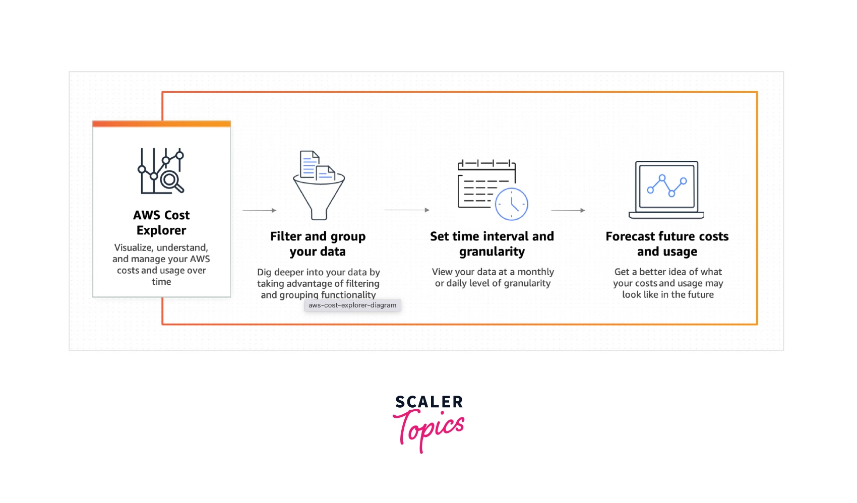 The working of AWS Cost explore is by first digging into the data and filtering and grouping the functionality that is like together. Then it views the data at detailed levels which is used to further forecast costs.