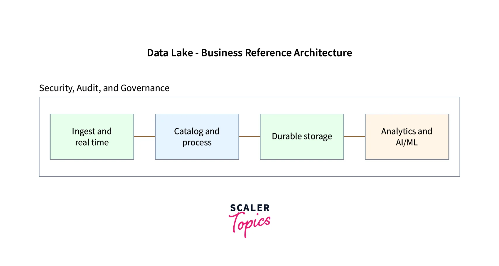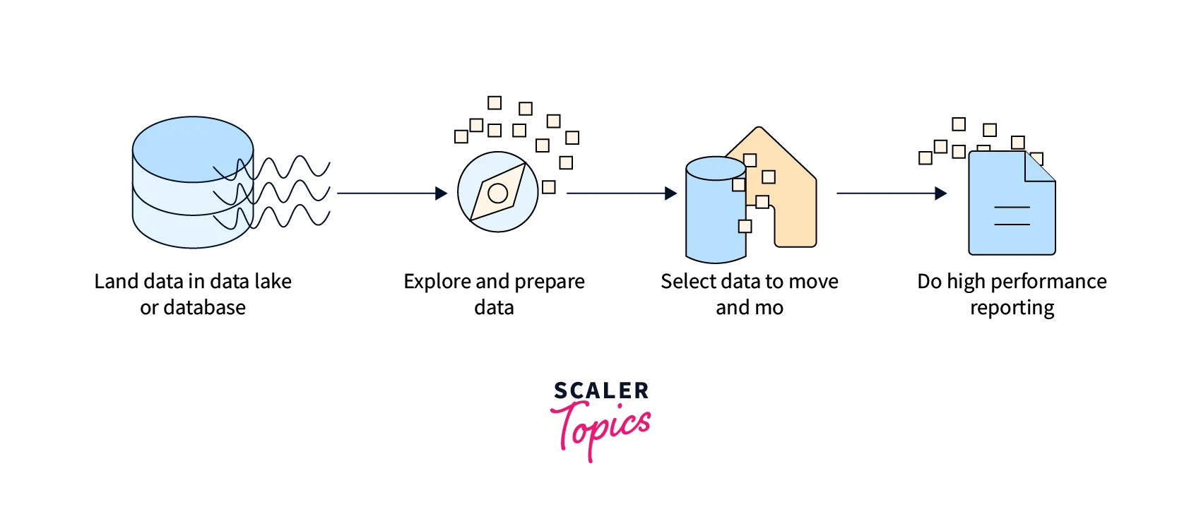 The tons of unorganized data are stored in a data lake or database. It is interpreted, catalogued, and converted into a tabular format to be stored in the data warehouse. The data is analyzed here in the data warehouse, and reports are generated.
