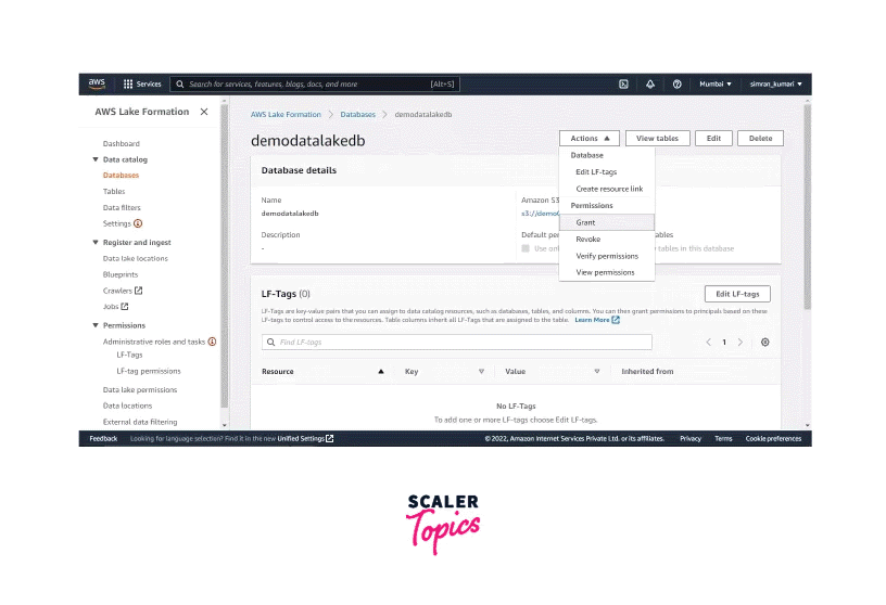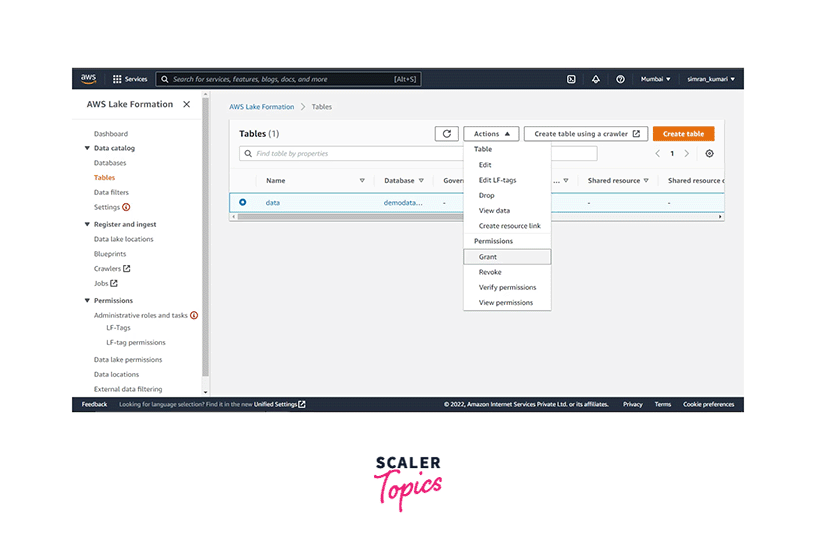 On the AWS Lake Formation console, click on the Tables option on the left menu. Select the Sales table and click on the Grant menu option under the Action dropdown menu.