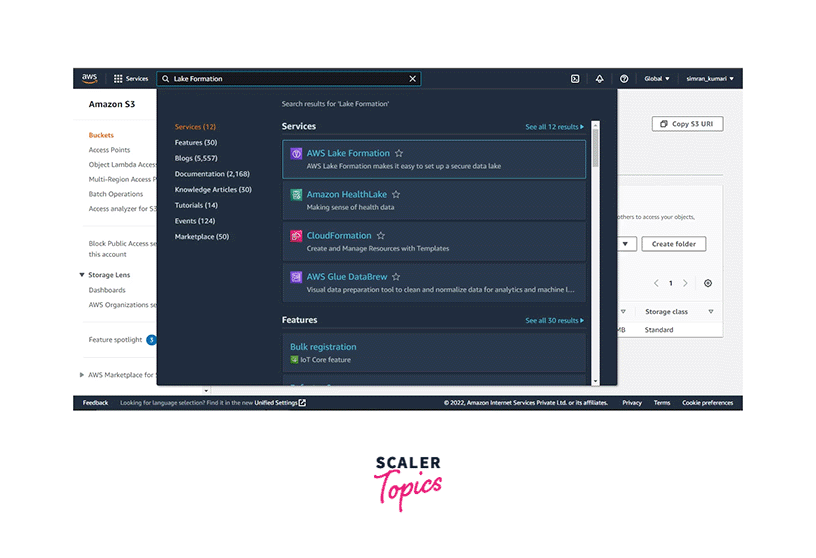 Go to the search bar of the console and search for Lake Formation. Click on AWS Lake Formation.