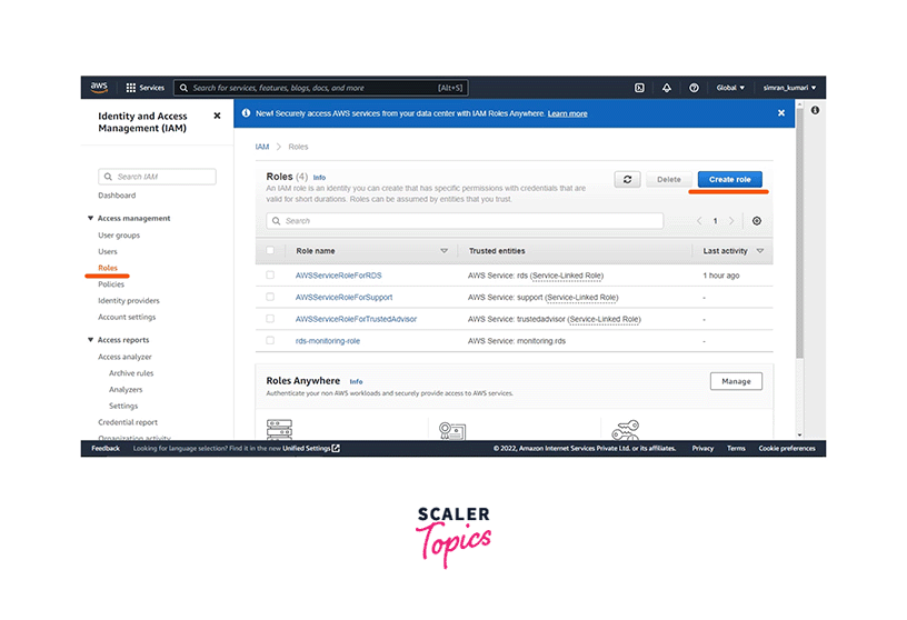 - Go to the IAM Management Console. Click on the Roles and then click on the Create role button.