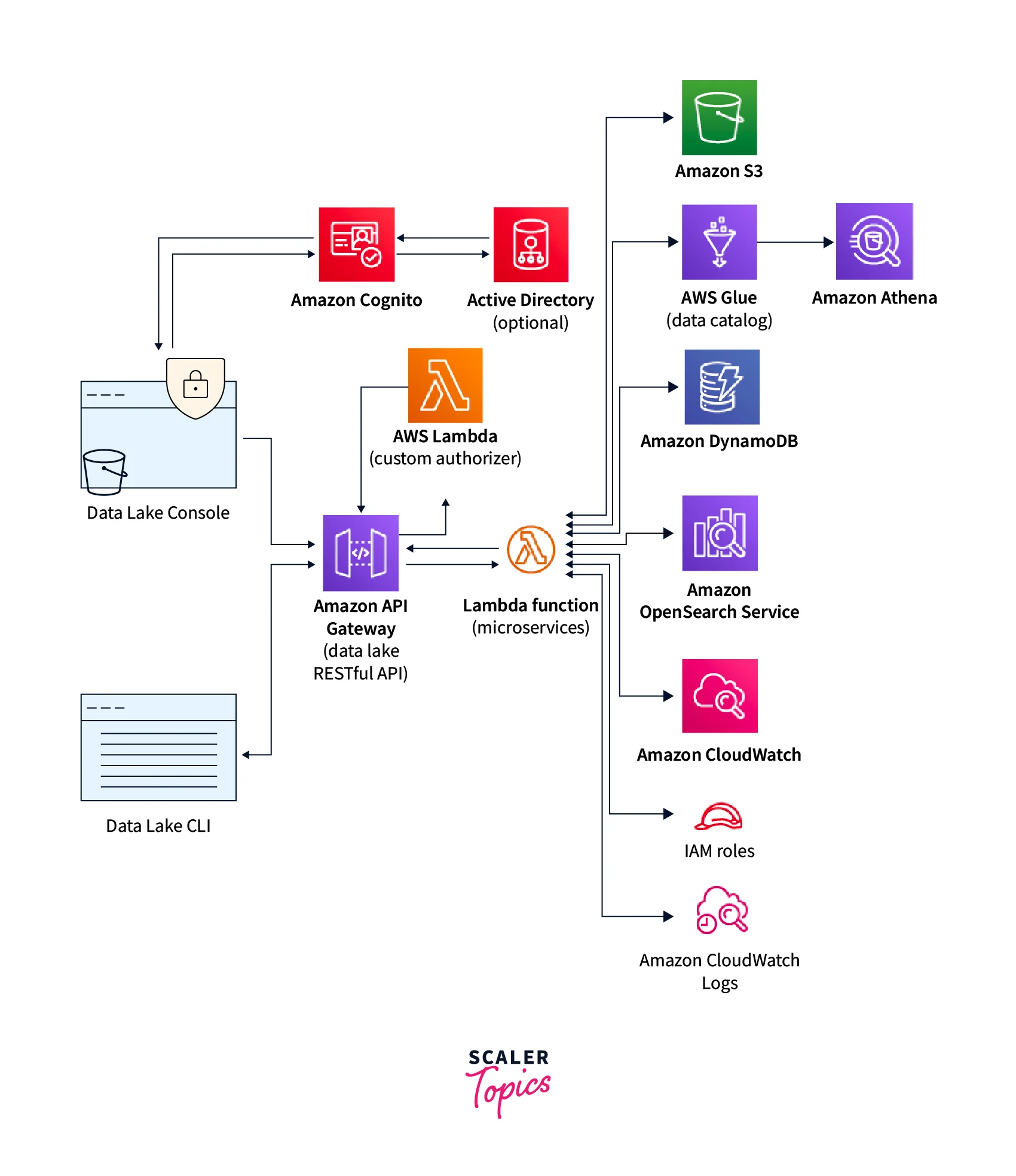 - The data lake implements a data lake API to provide access to data lake microservices like AWS Lambda.