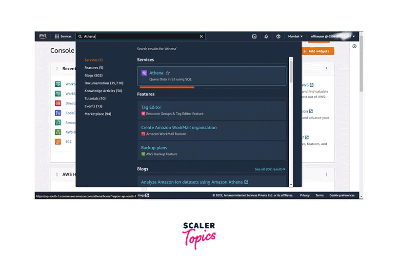 login to the console sign-in URL, which we have to get in step one, using the username and password. Let’s first login with the office user. Go to the search bar of the console and search for Athena. Click on Athena.