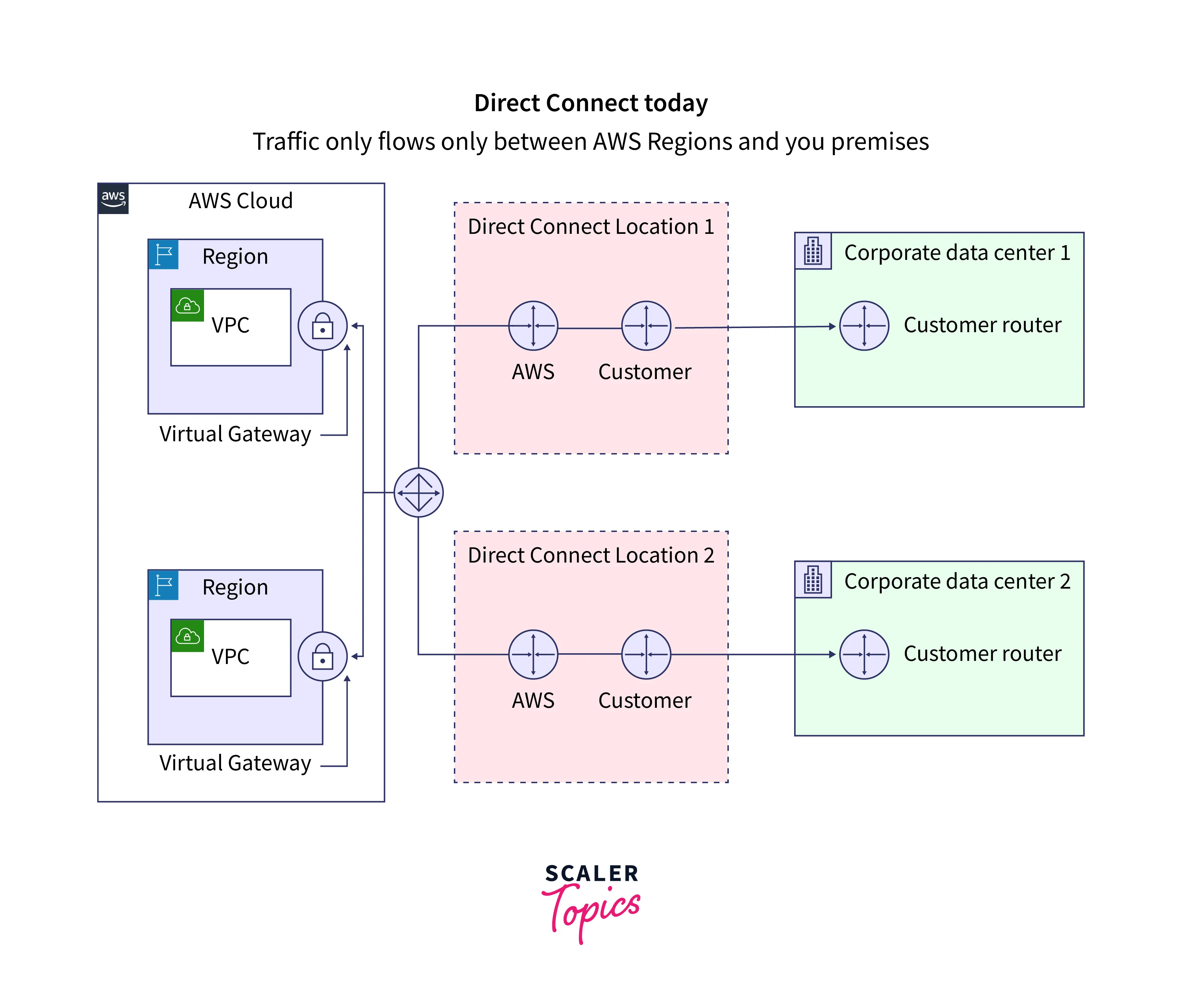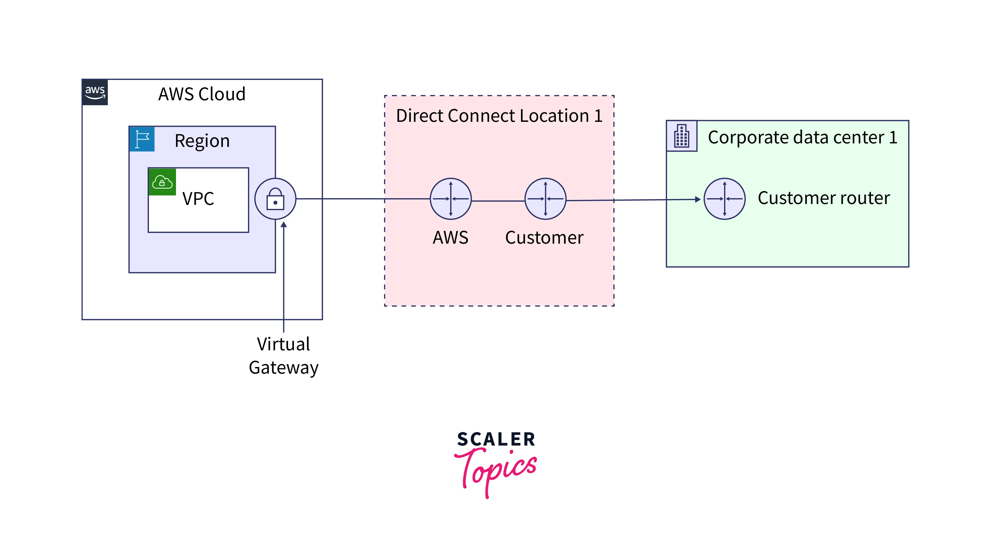 The below image demonstrates the traffic flow from the customer data center to AWS region via the AWS Direct Connect location