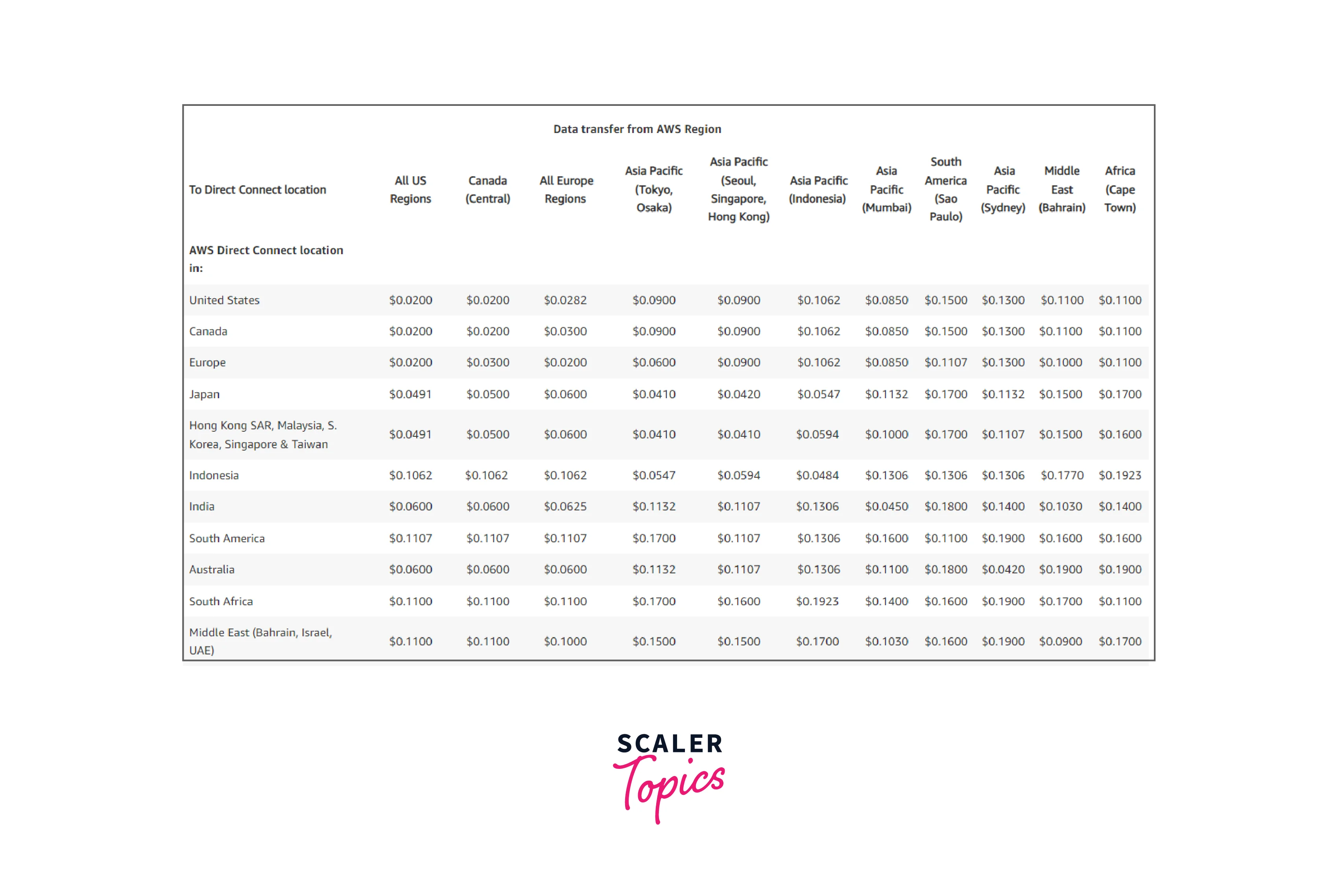 AWS Direct Connect pricing components include capacity, port hours, and data transfer out.