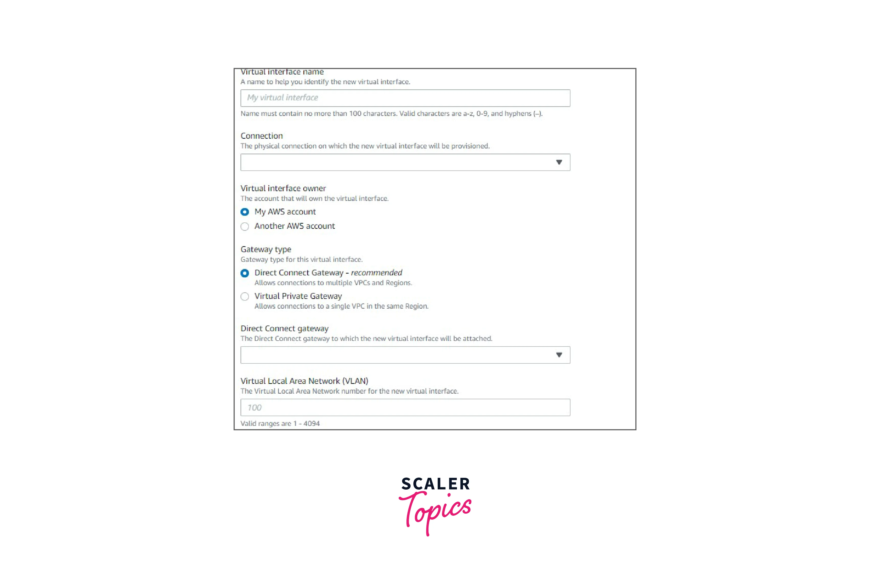 In VIF, we choose either a Direct Connect gateway or a Virtual Private Gateway.